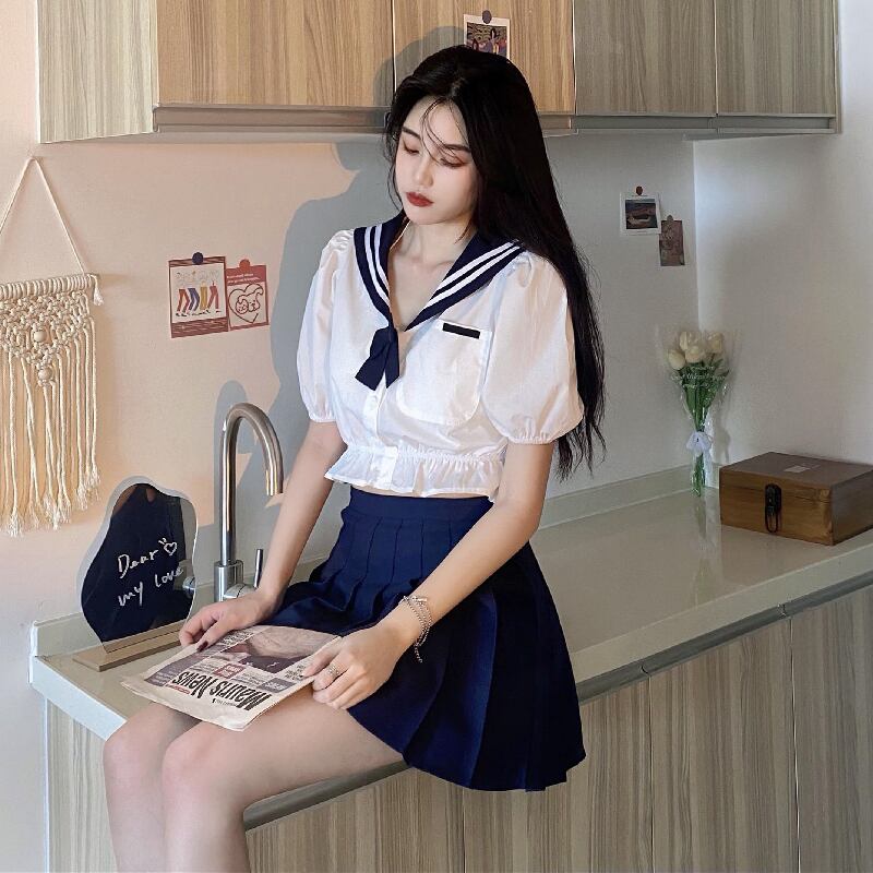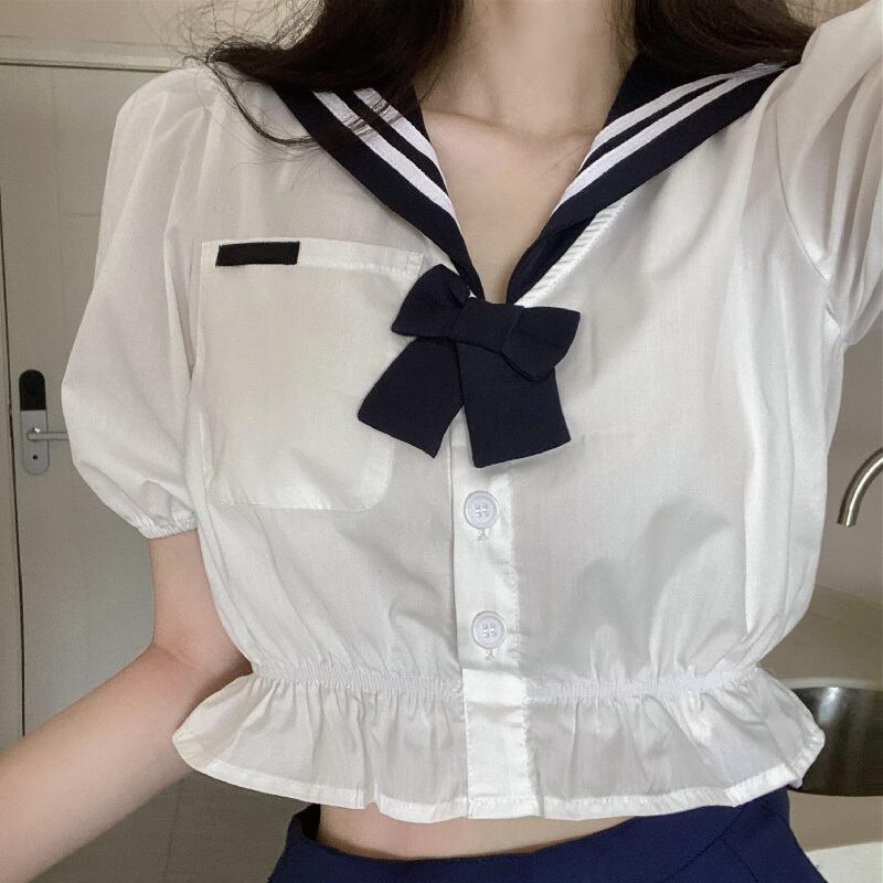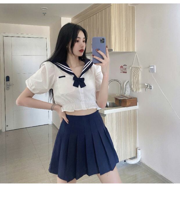 サマーシャツ ネイビーカラー半袖スリーブハイウェストウェストプリーツ ショート ハーフスリーブ 夏物 スカート ケッペル92946025942