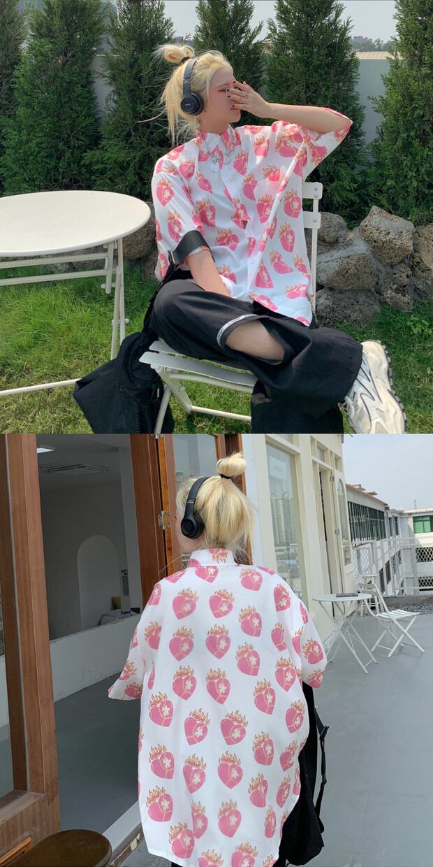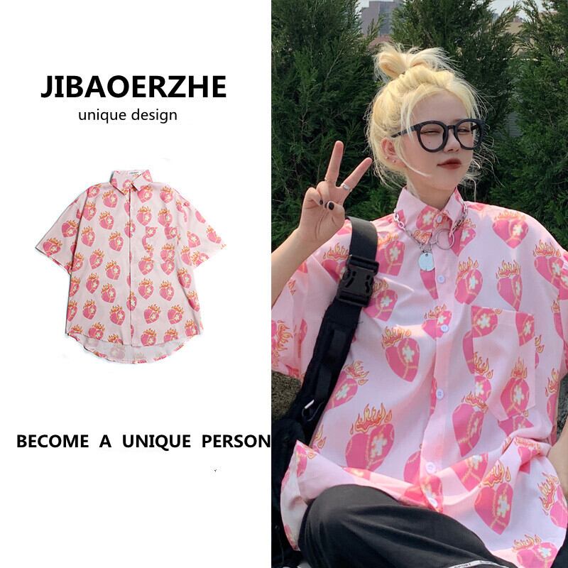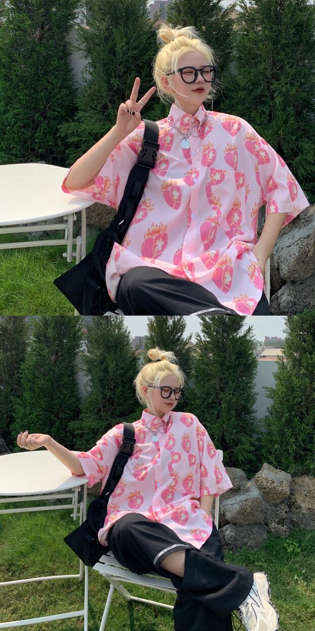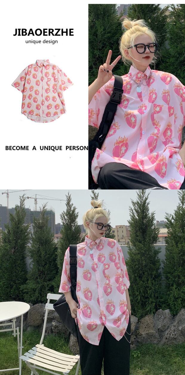 スタイルルーズシャツ スタンダードプリントカジュアルTシャツ サマー ピンク レトロ 夏物 ケッペル57095678914