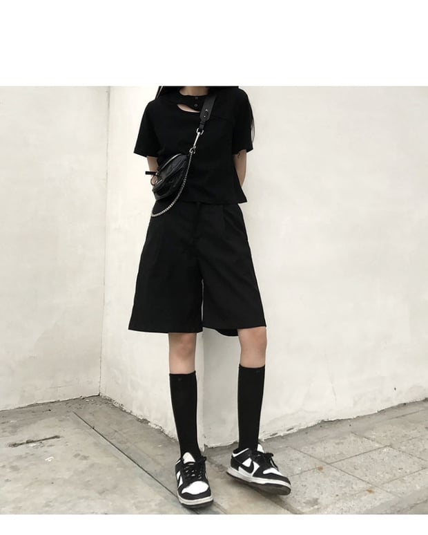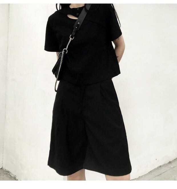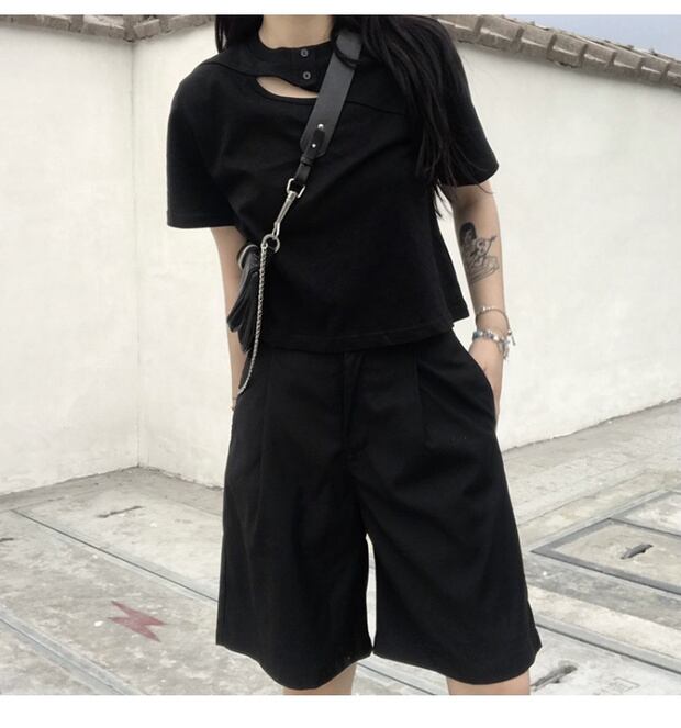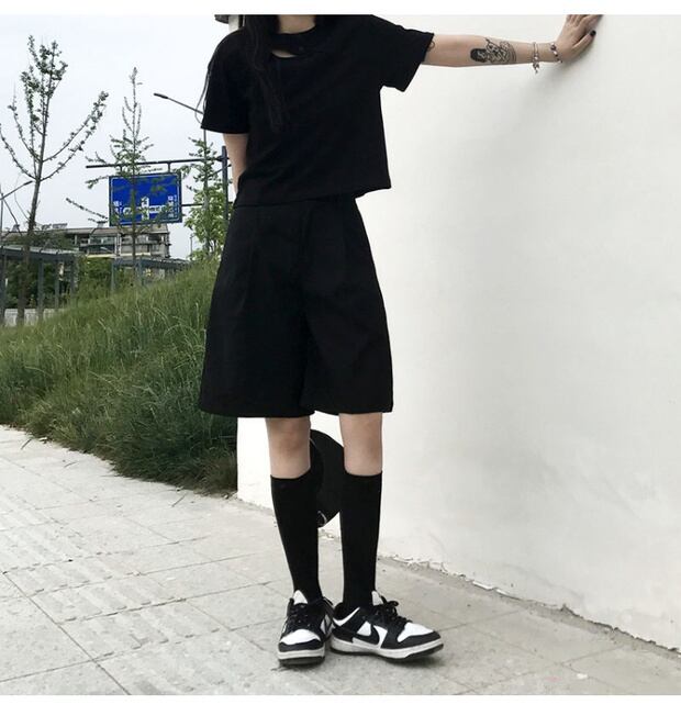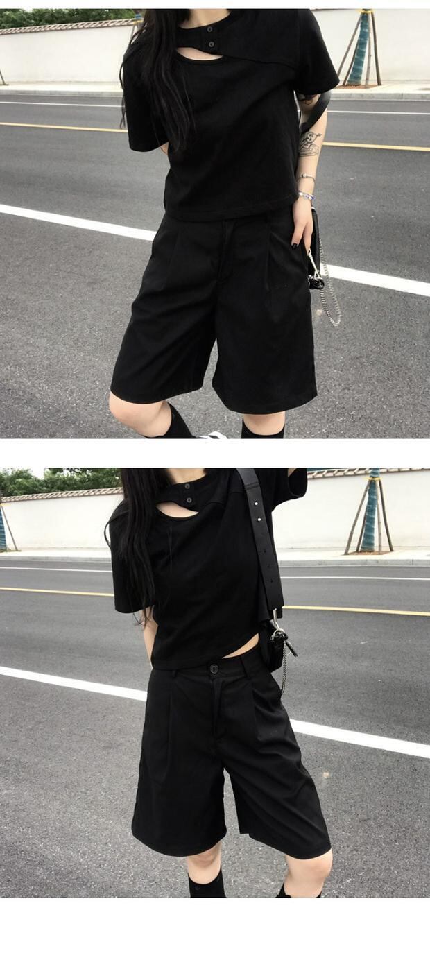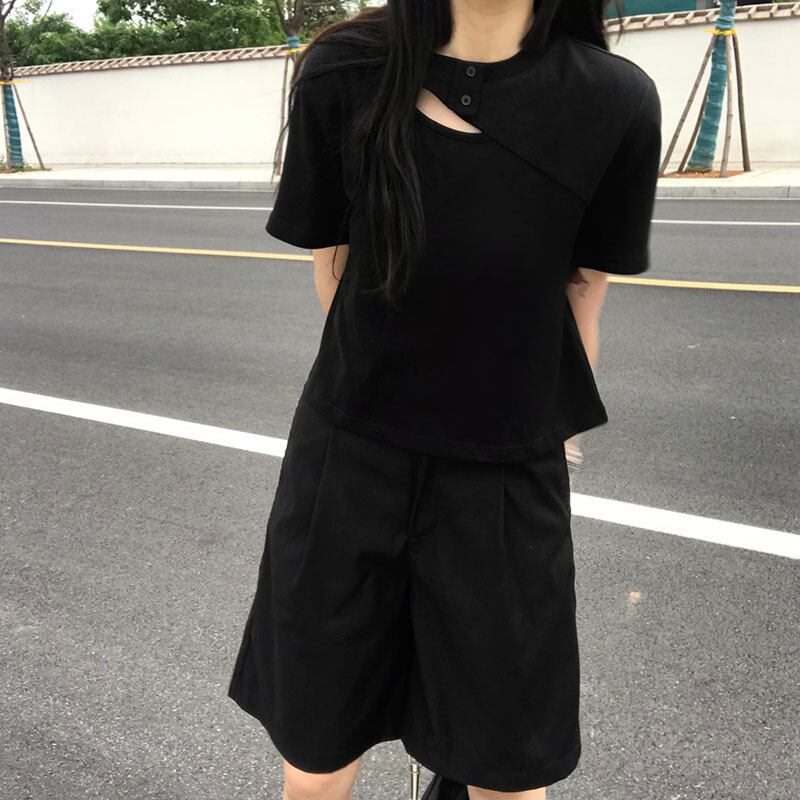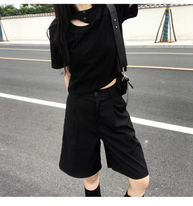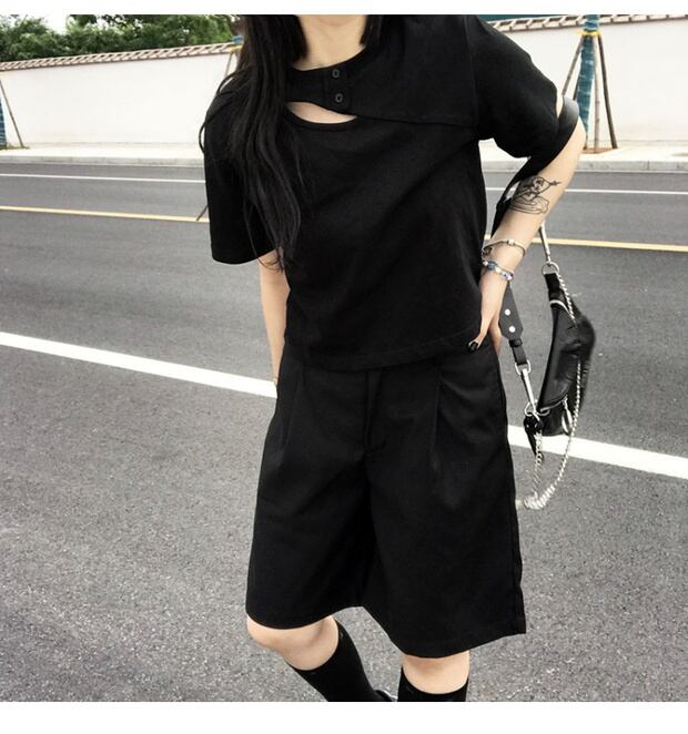 サマーカジュアルショートTシャツ ブラックラウンドネックトップス ルーズショーツ 夏物 ブルマー Oネック ケッペル67890389094