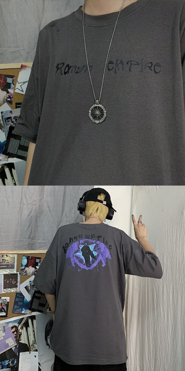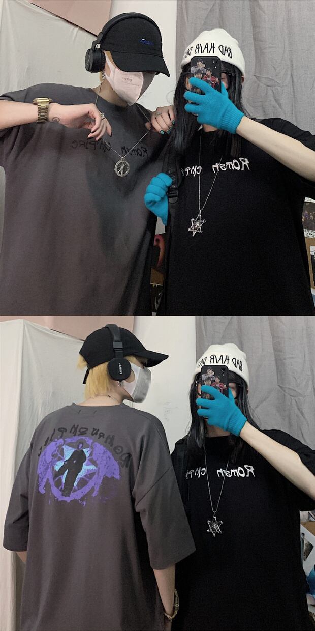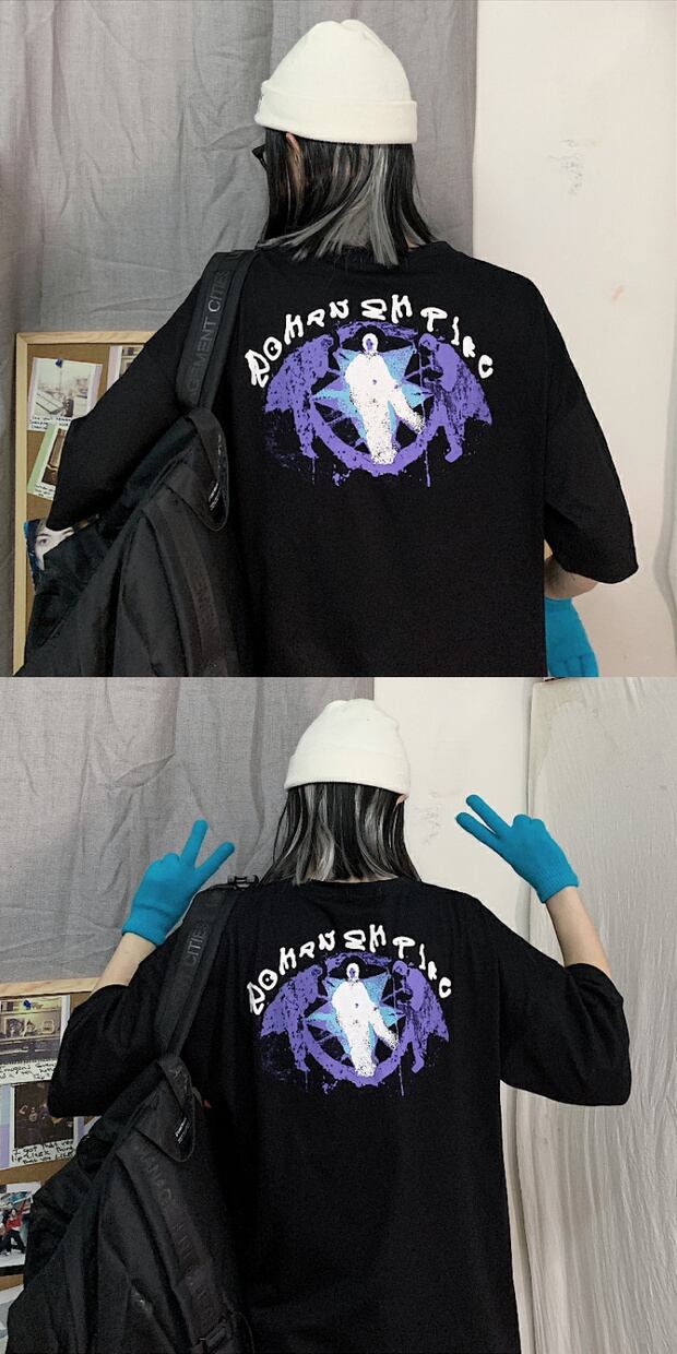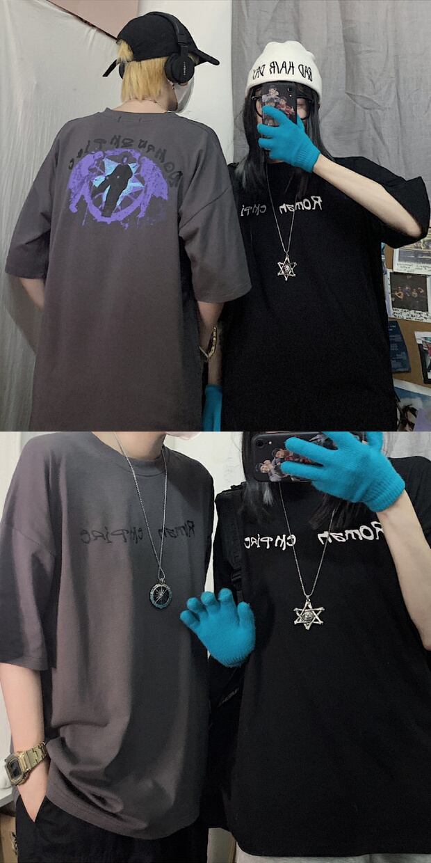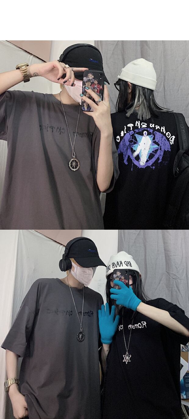 スタンダードダークプリント柄ルーズラウンドネックショート レトロ 半袖 ハーフスリーブ ストリート かわいい Oネック ケッペル80448247023