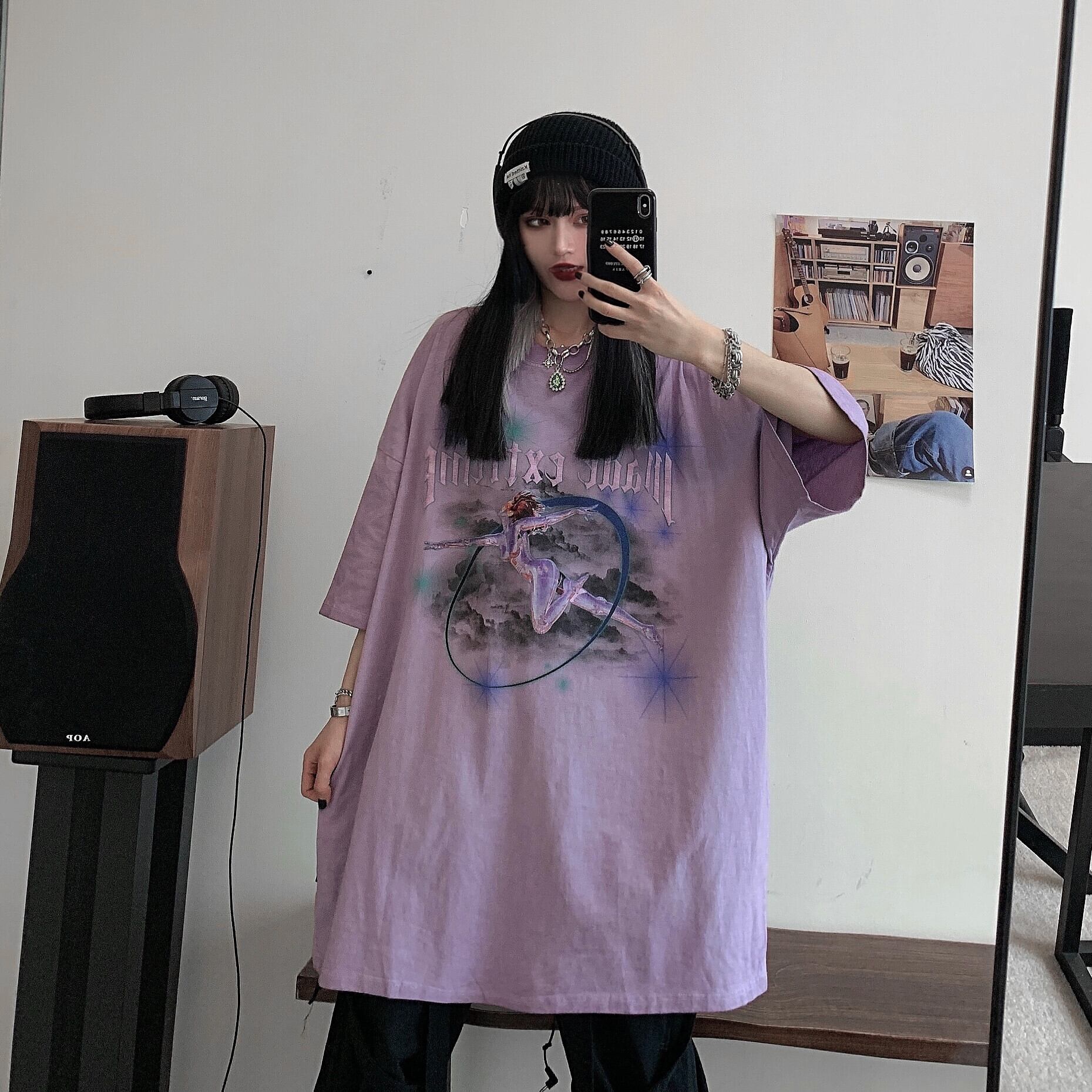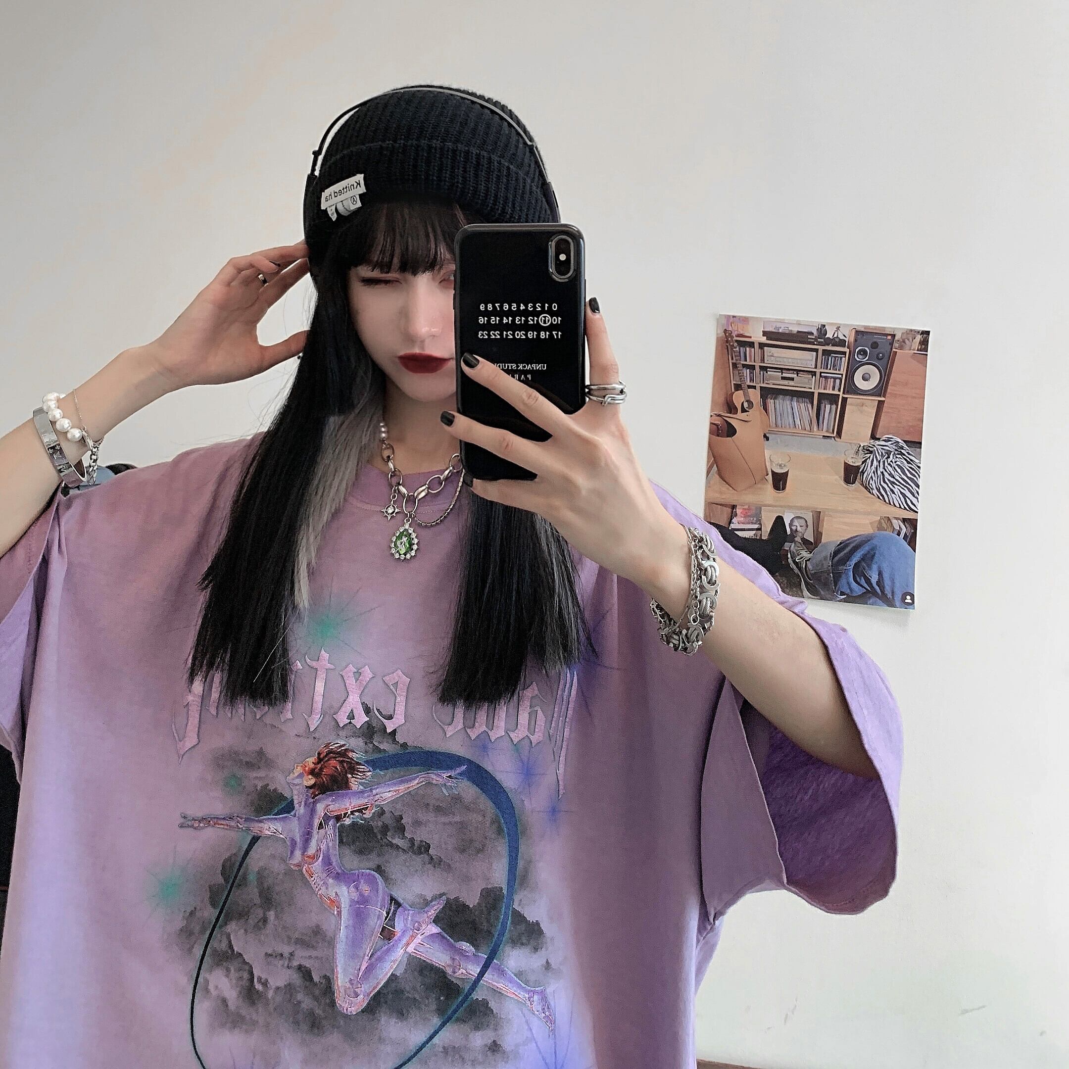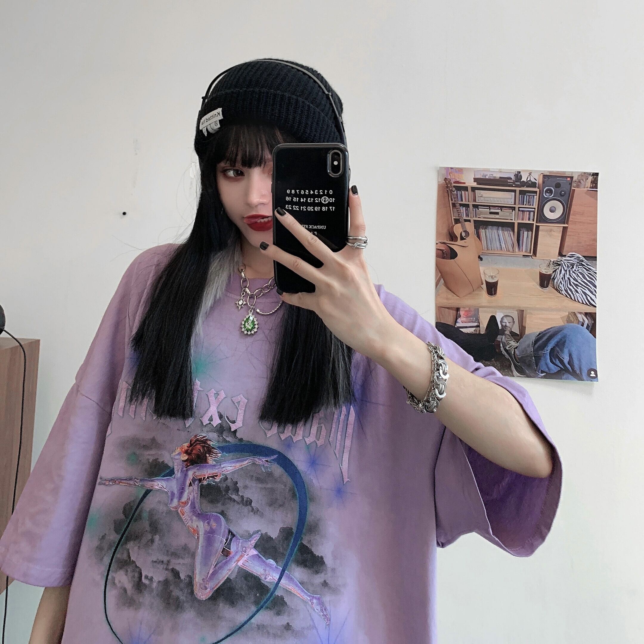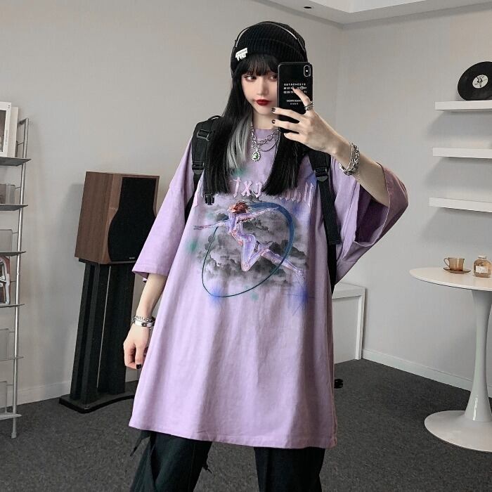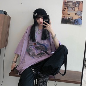 ダークスタンダードプリント柄ルーズTシャツ トップス レトロ ストリート ケッペル46183330115