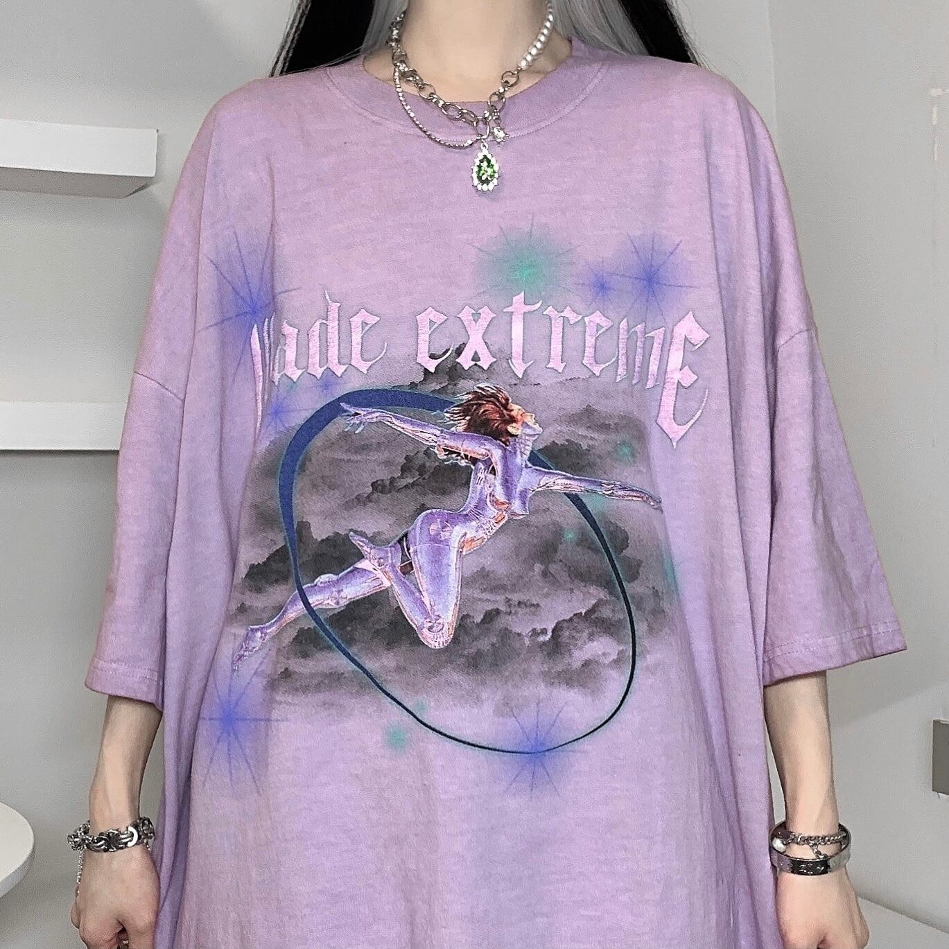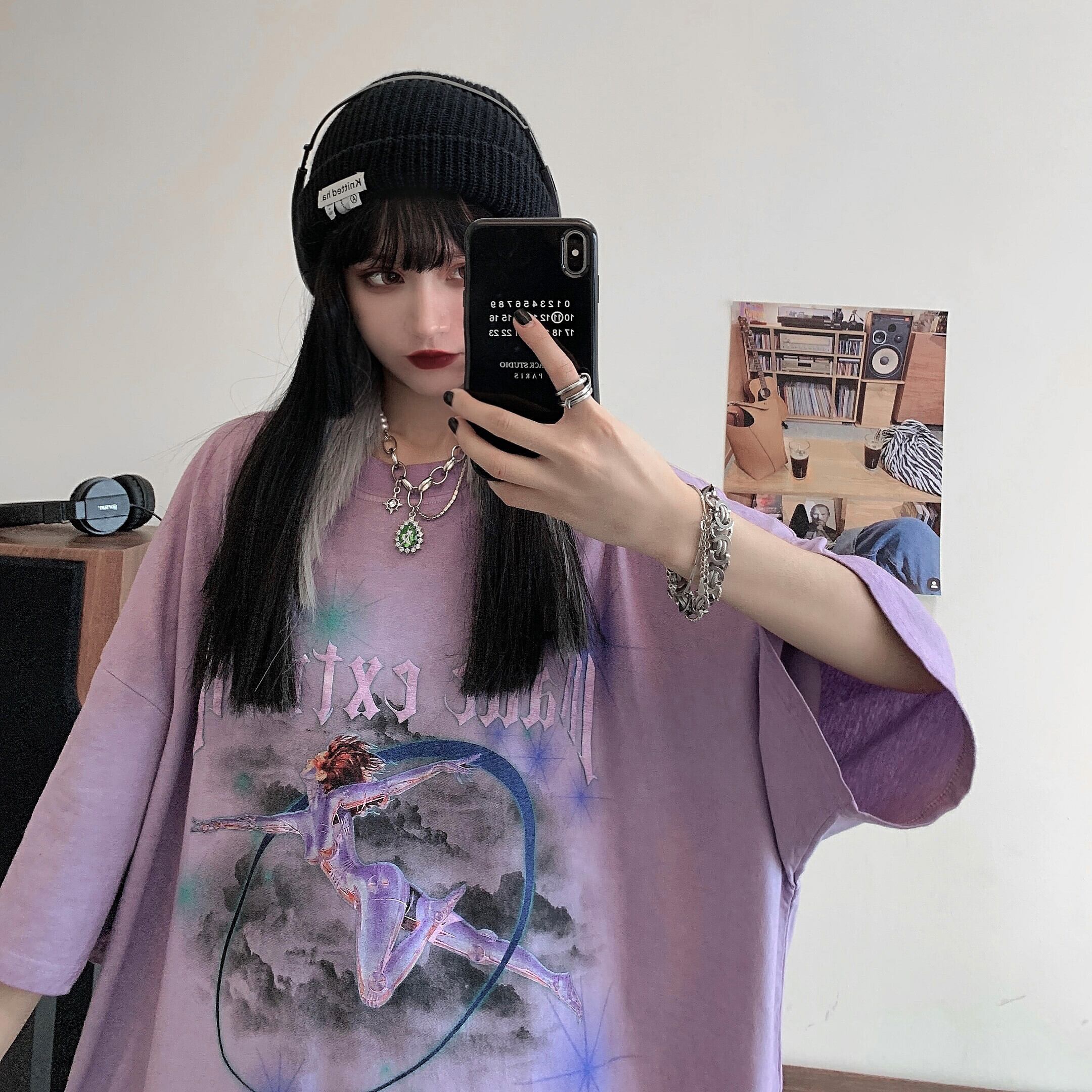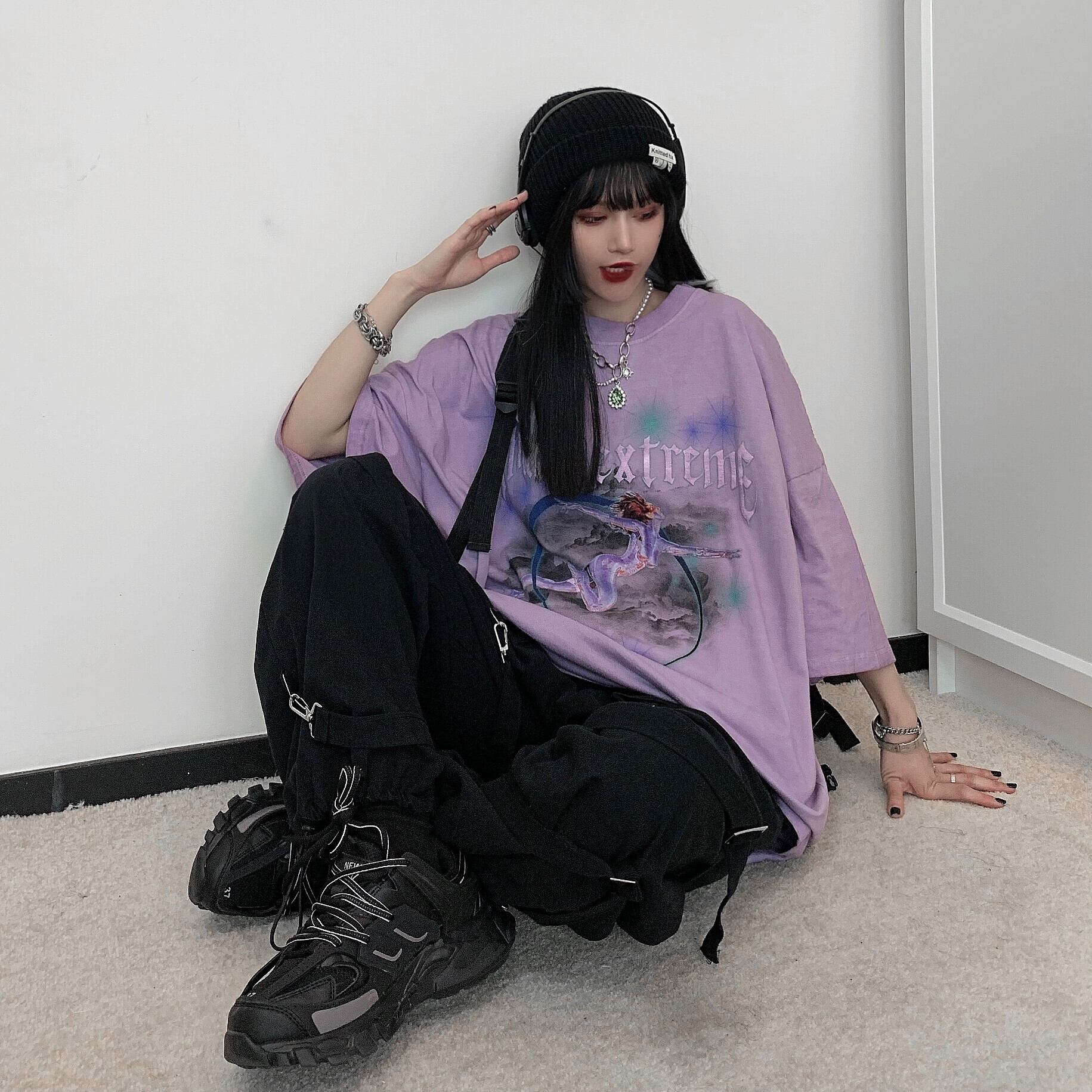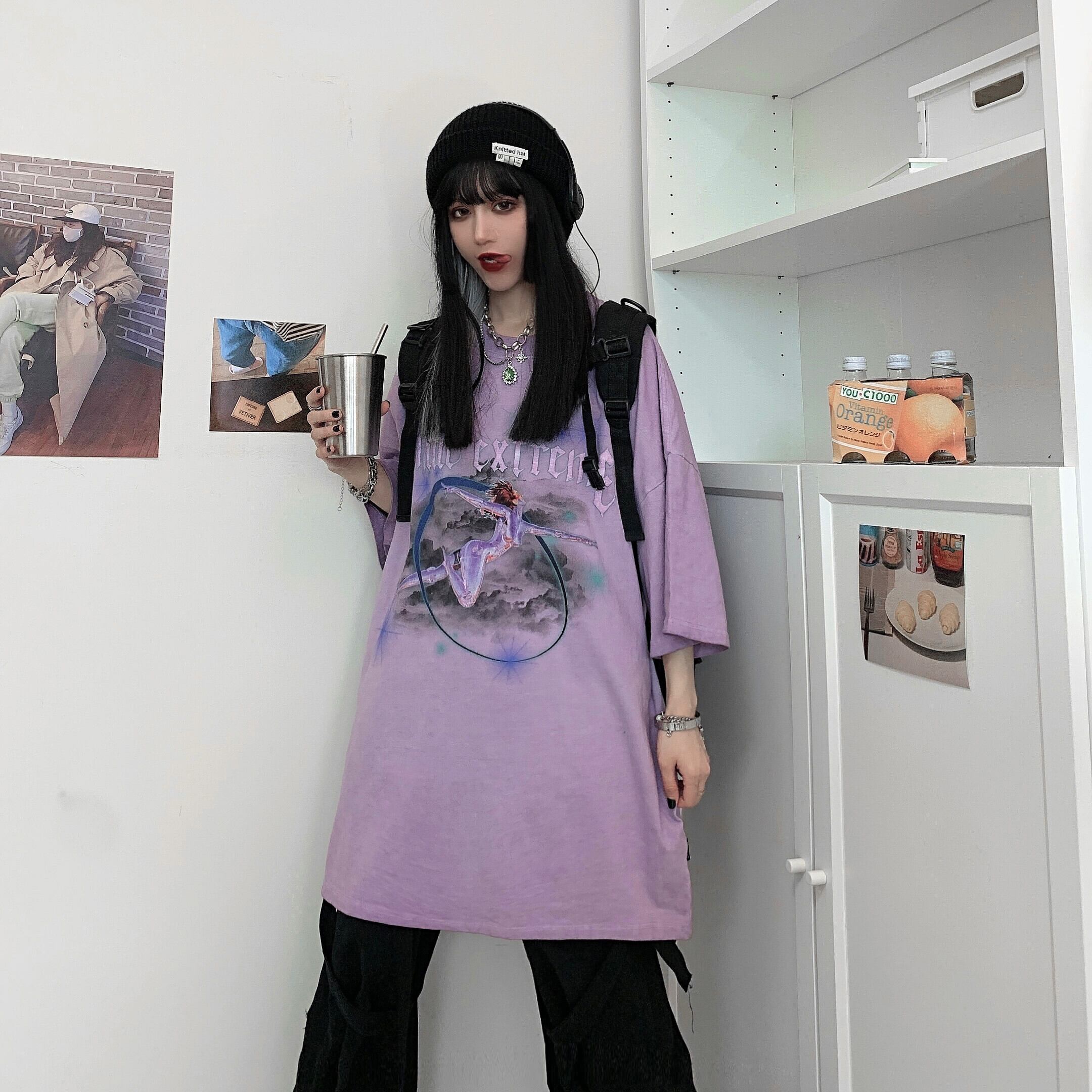 ダークスタンダードプリント柄ルーズTシャツ トップス レトロ ストリート ケッペル46183330115