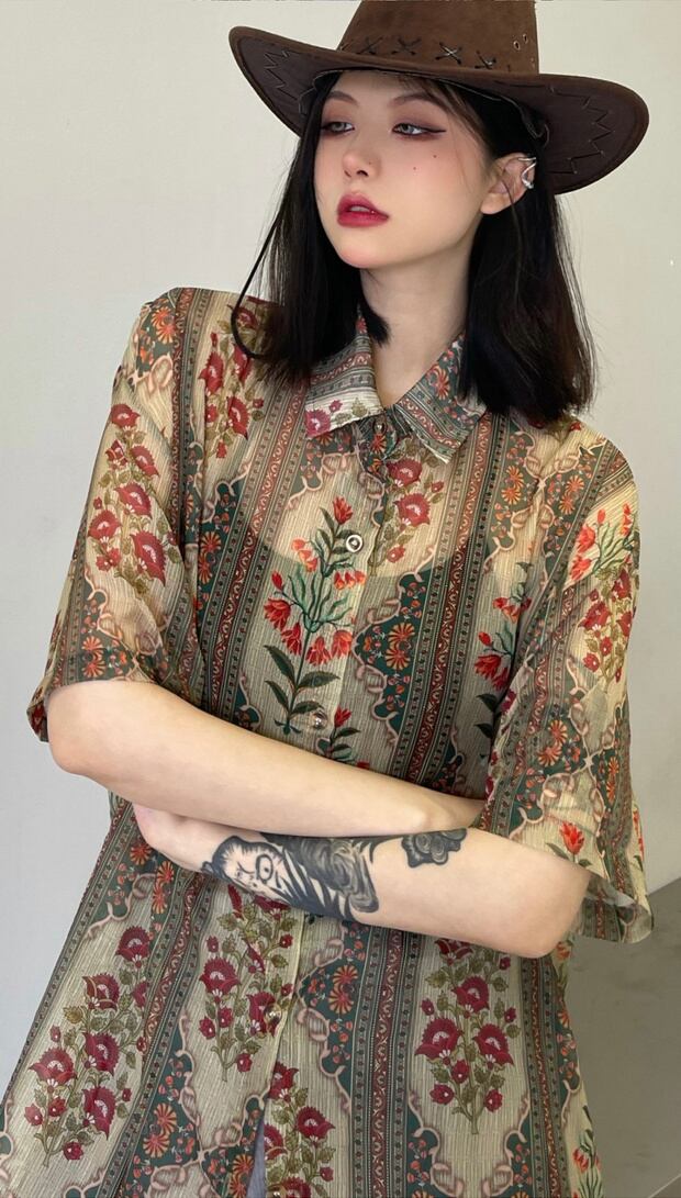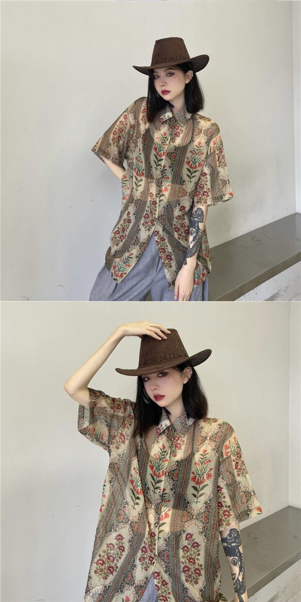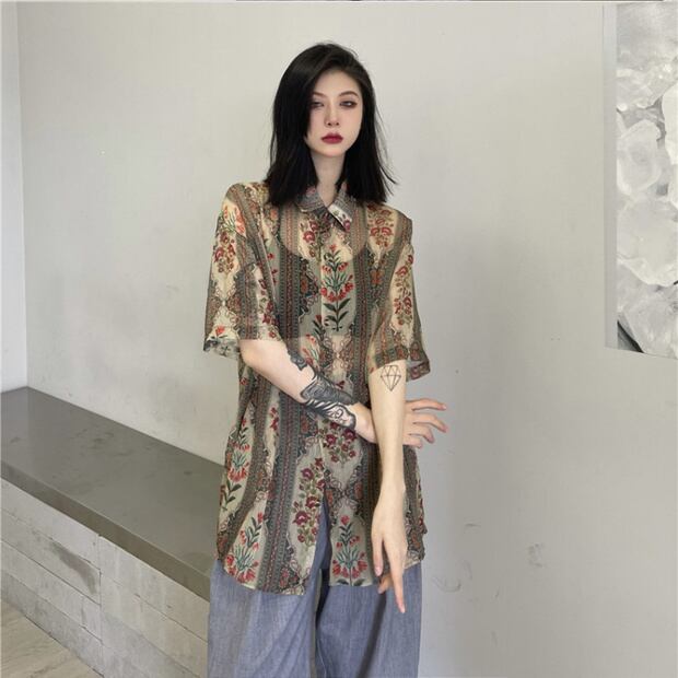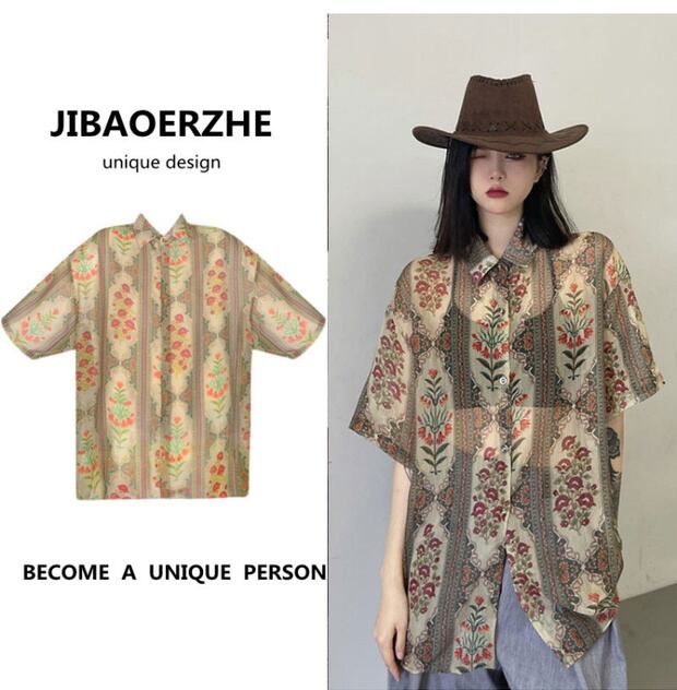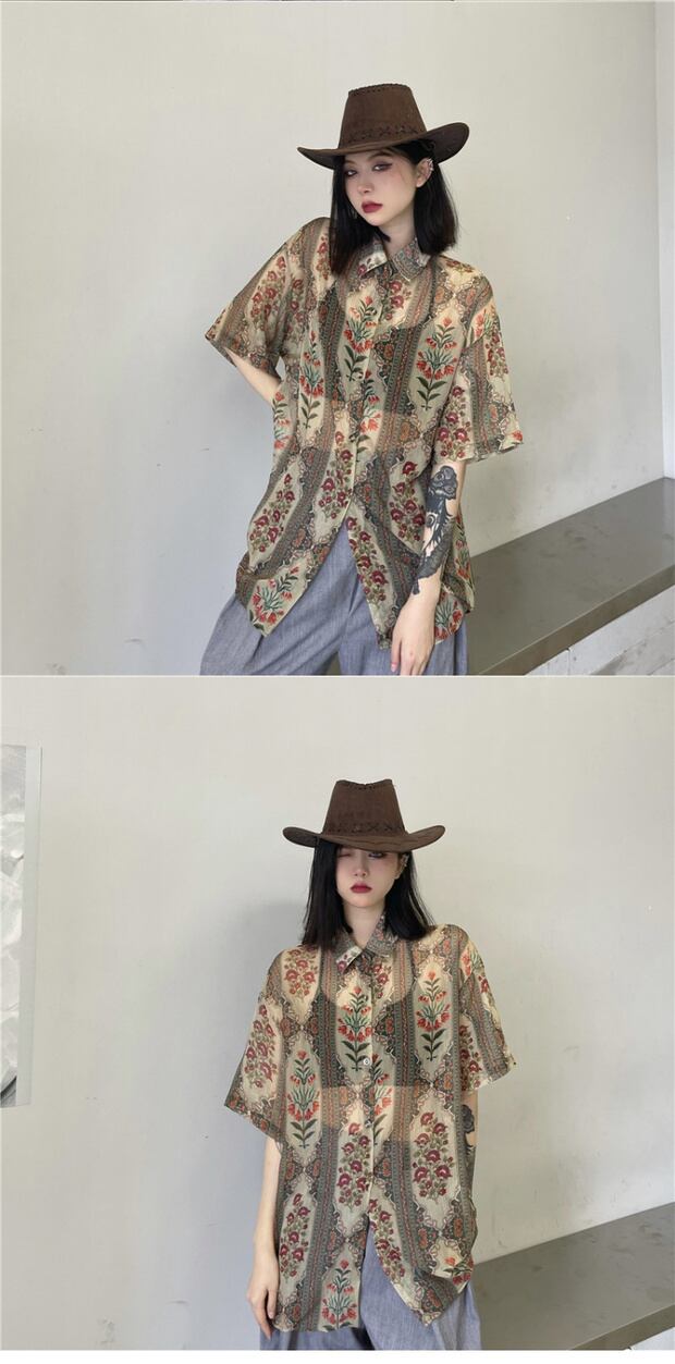 サマールーズシャツ スタンダードカジュアルシフォンプリント レトロ 夏物 ケッペル48756065273