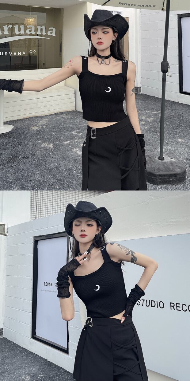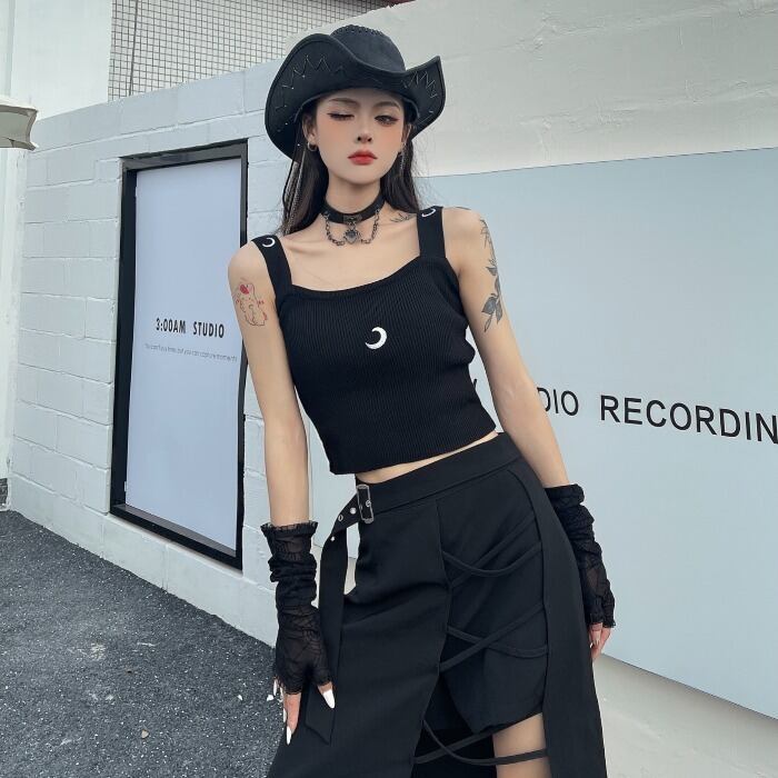 ダークトップス ブラックニットクロップトップ シャツ レッド 刺繍 ケッペル31994200978