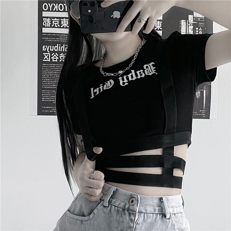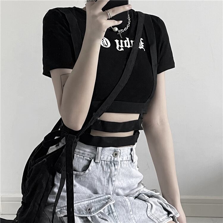 サマーショートクロップドTシャツ ダークプリントクロップトップ トップス 夏物 ケッペル57188075226