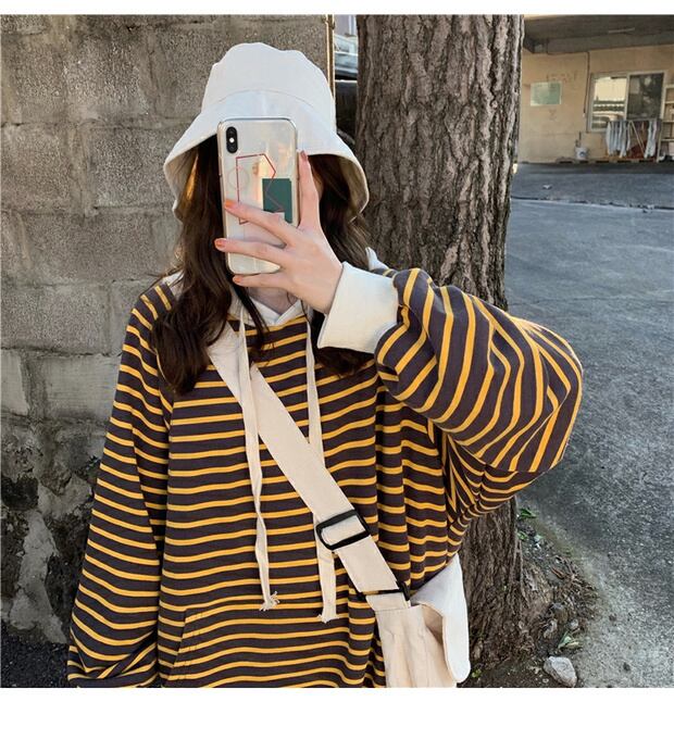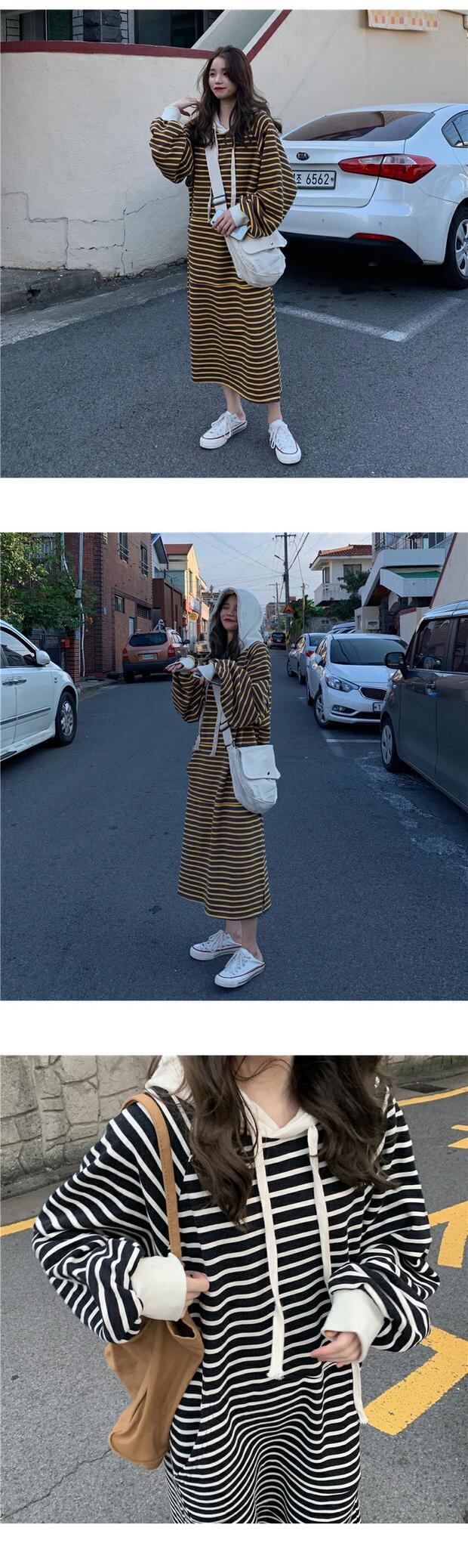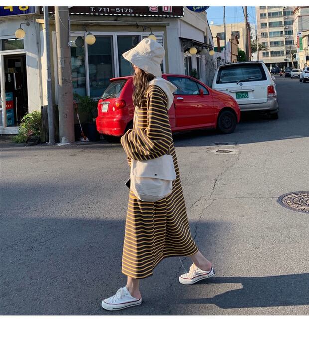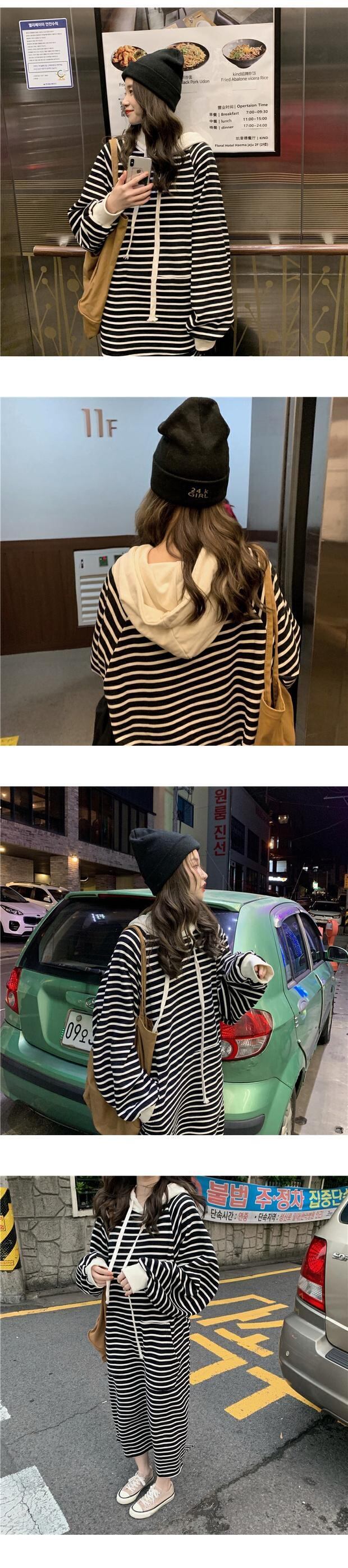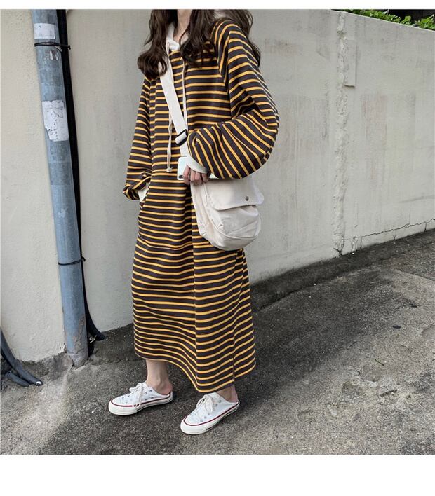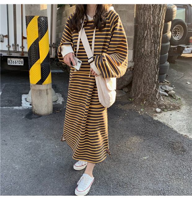 スタイルルーズセーター レディースオータムウィンターストライプフードギャザー長袖スリーブドレス トップス ロング 秋物 冬物 ケッペル61214737550