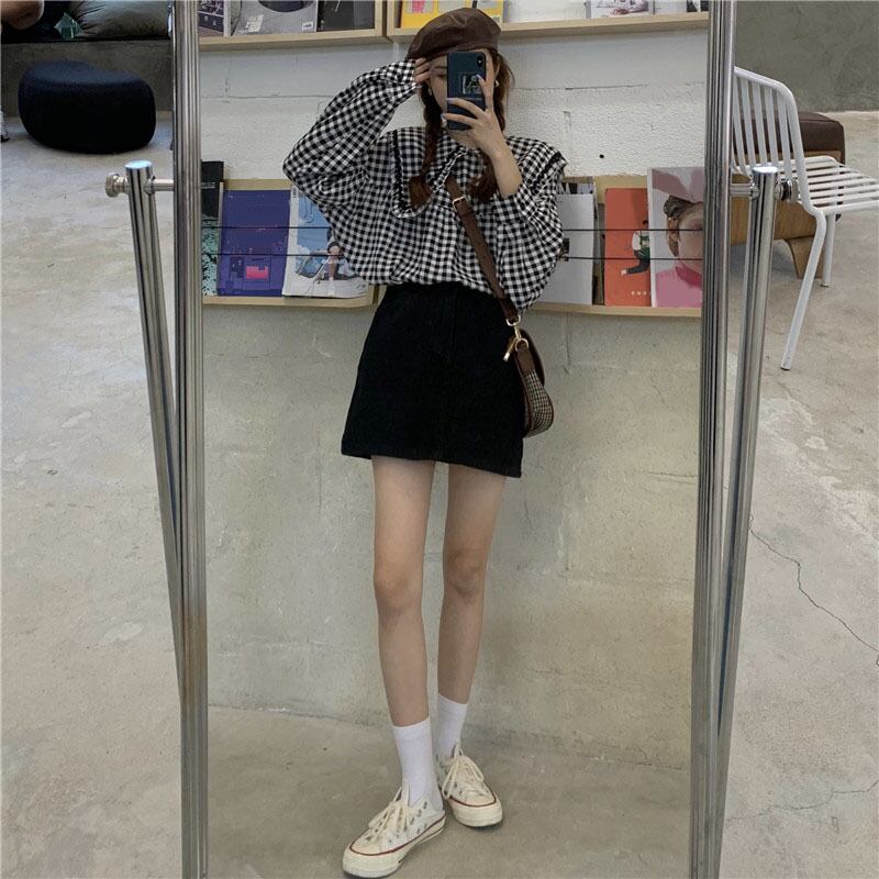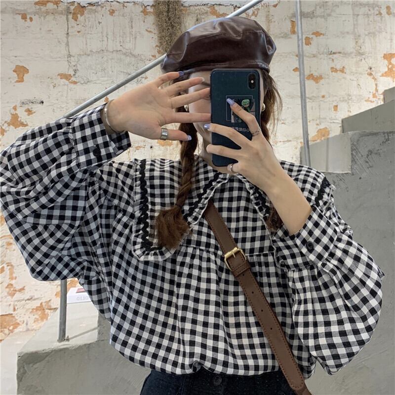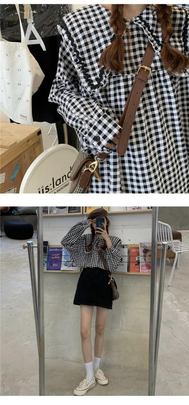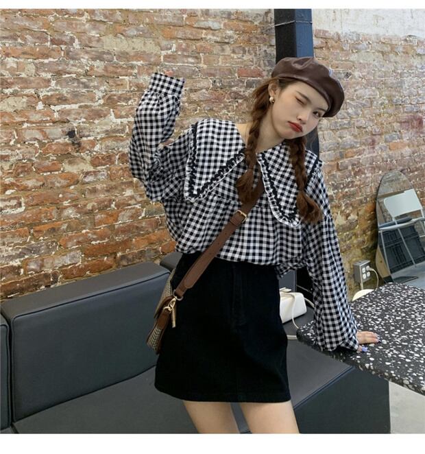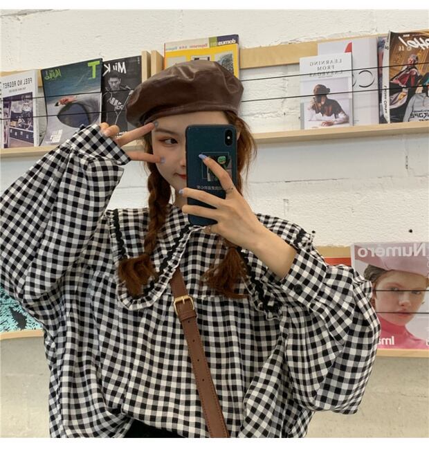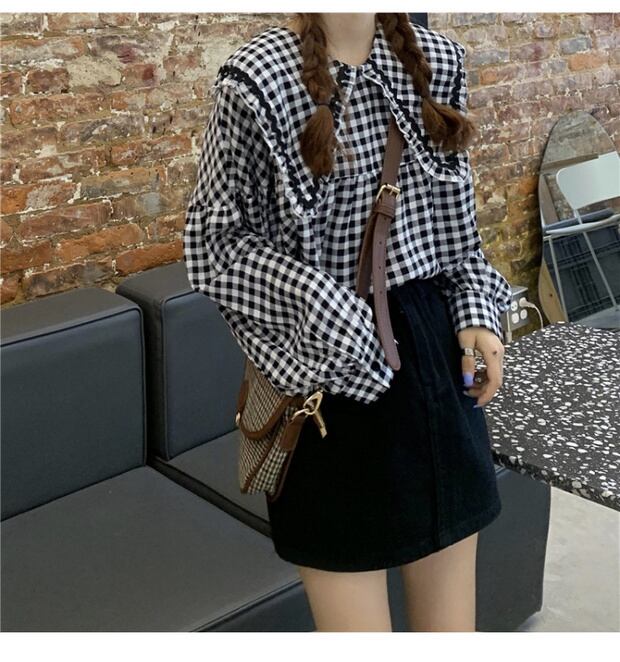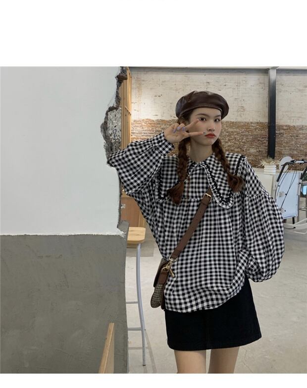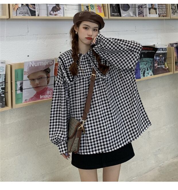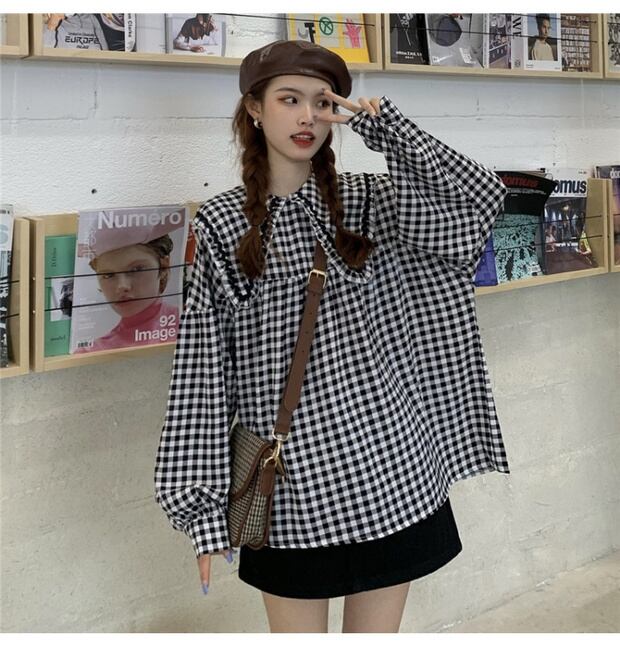 スプリングオータムカジュアルシャツ カラー格子柄ルーズトップス ロング 春物 秋物 ケッペル93064260402