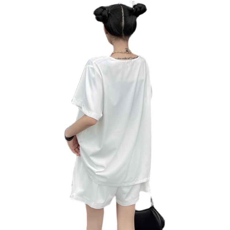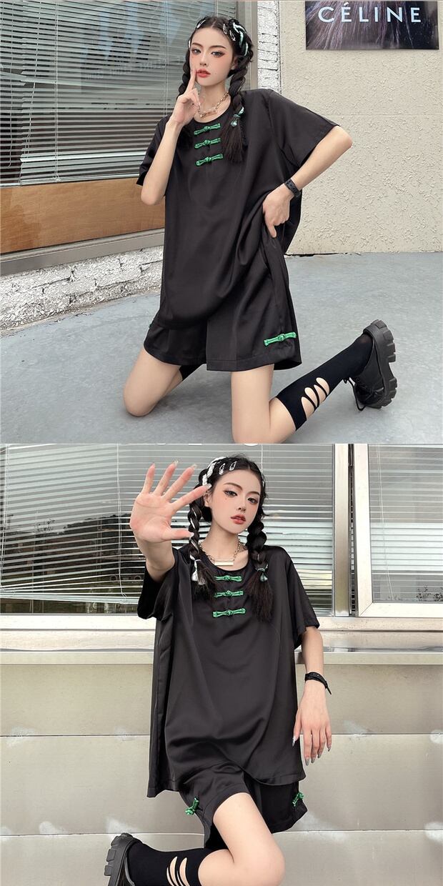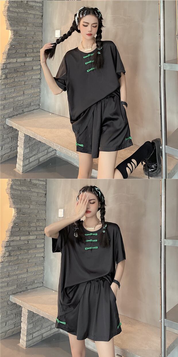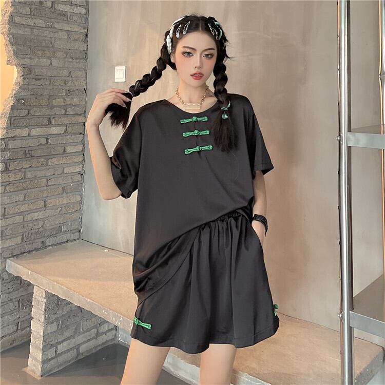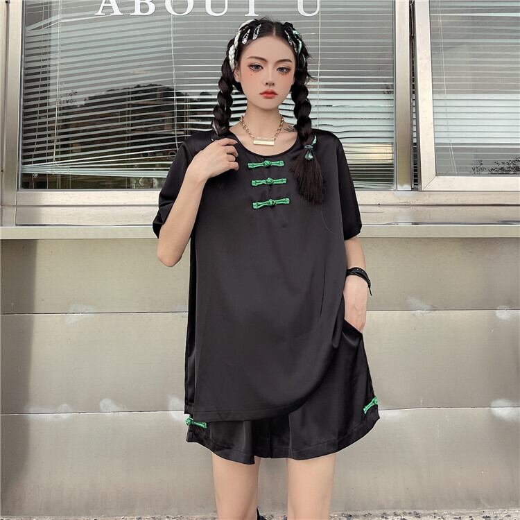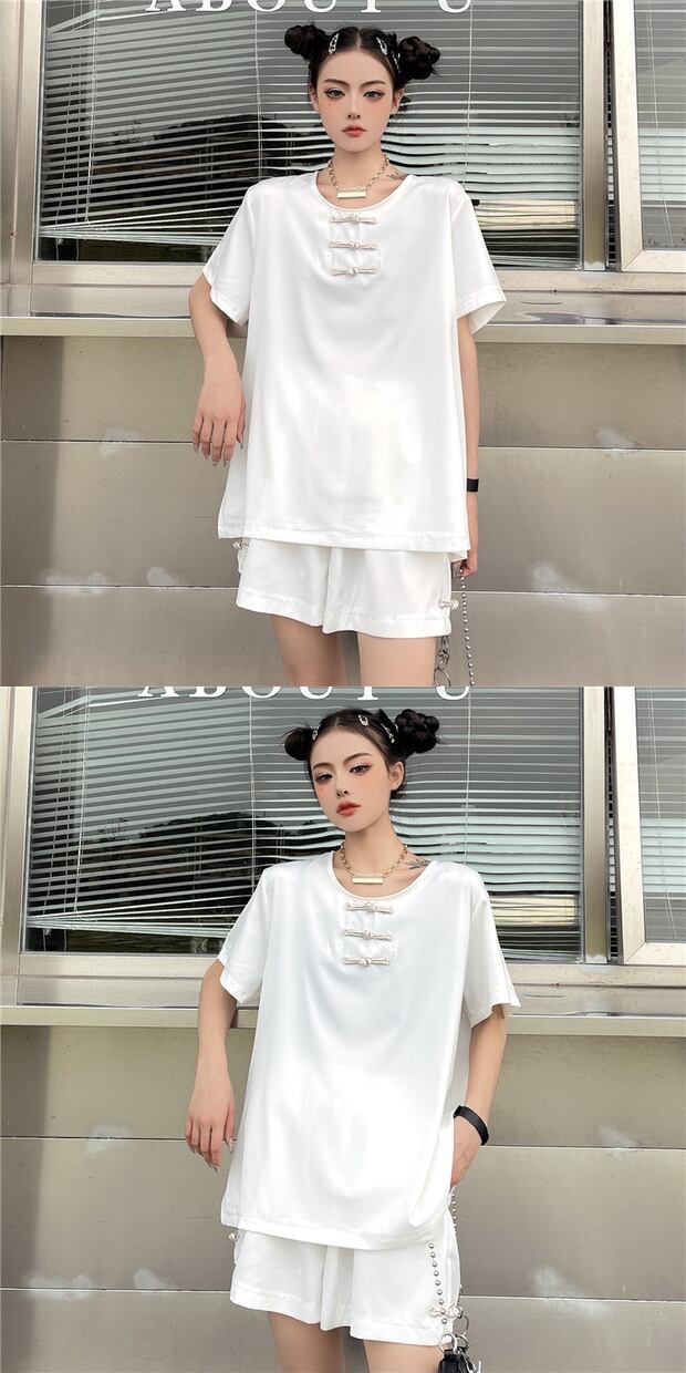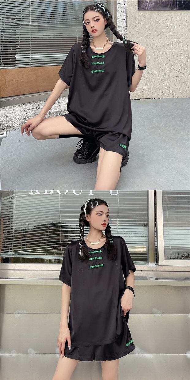 スタイルサマースタンダードルーズボタンラウンドネックTシャツ トップス ショーツ レトロ 夏物 ブルマー Oネック ケッペル48259355862
