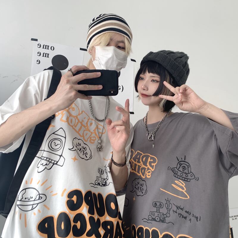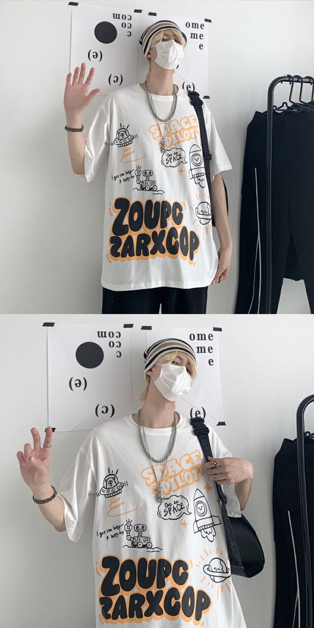 プリント柄ラウンドネックTシャツ サマーカジュアルルーズトップス ストリート 大きめサイズ 夏物 Oネック ケッペル73875531567
