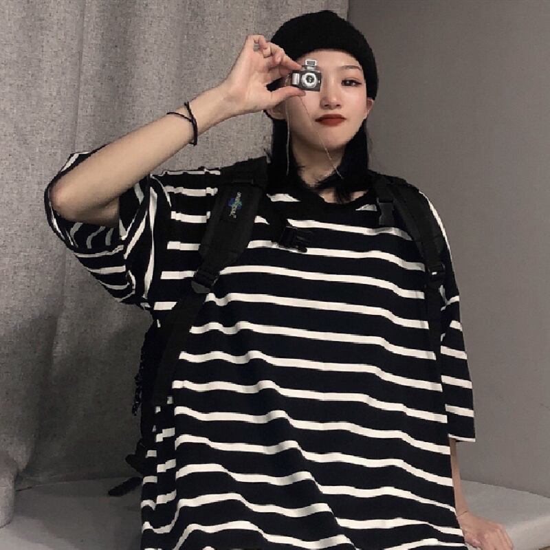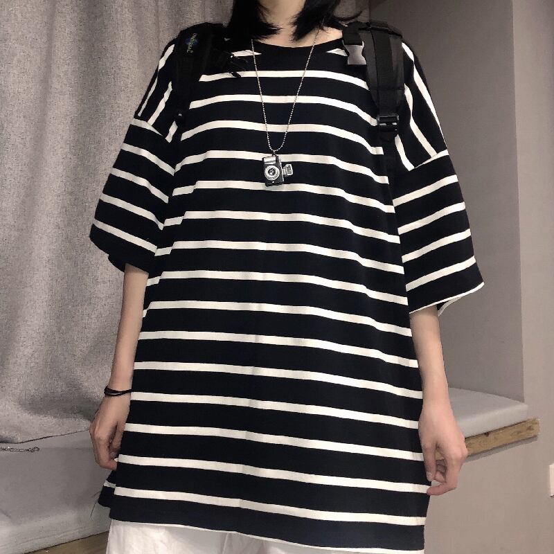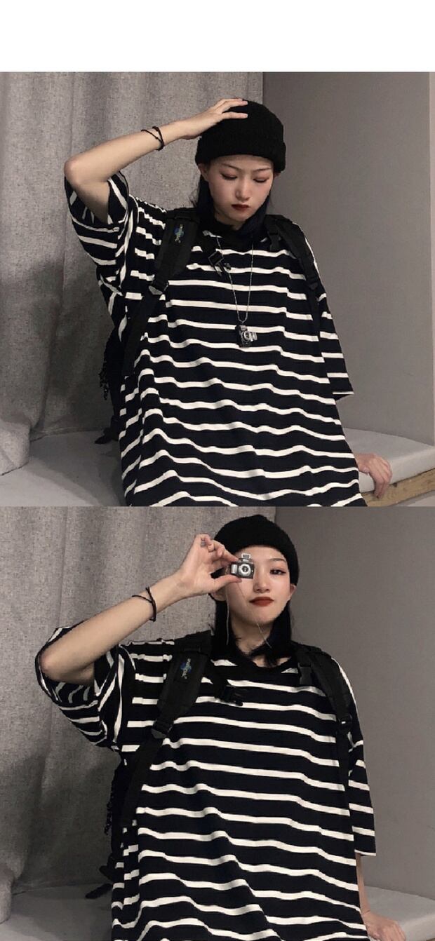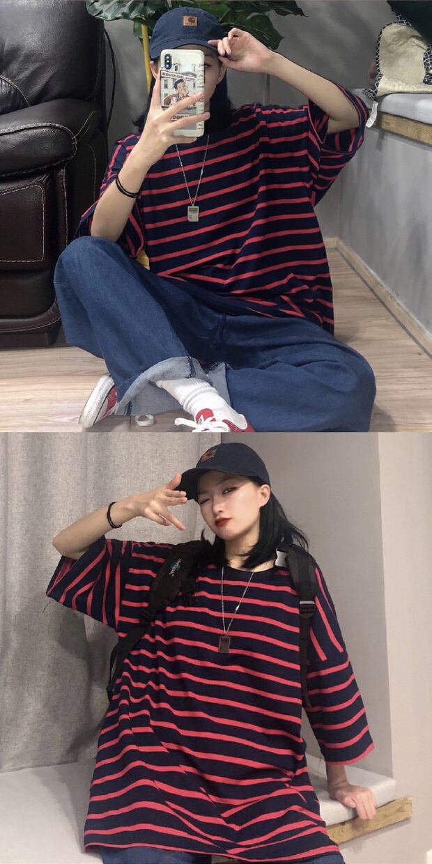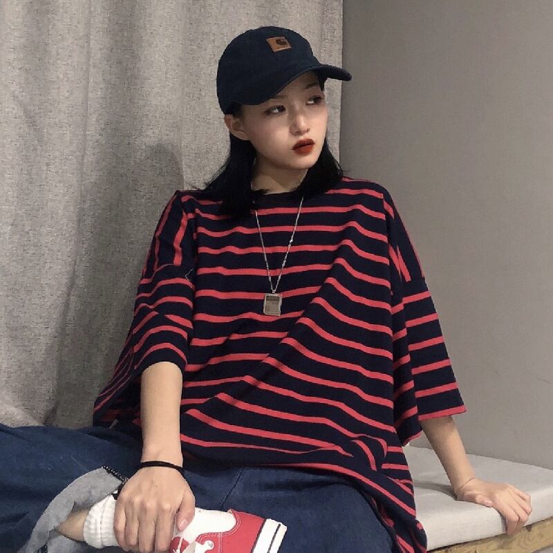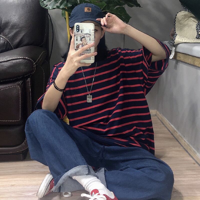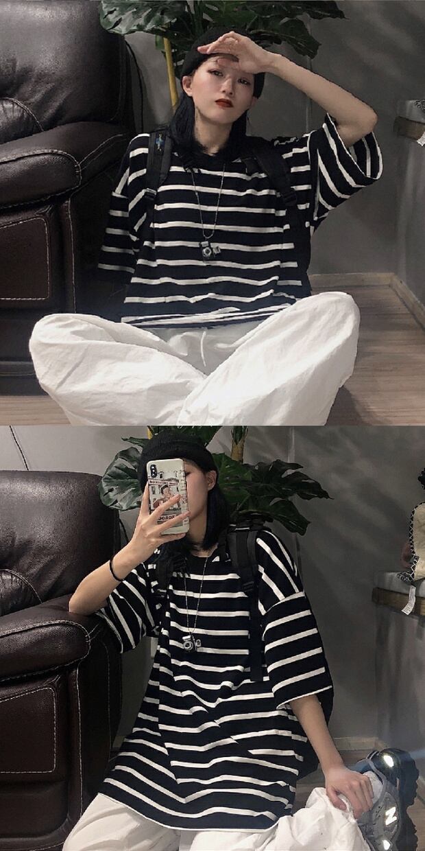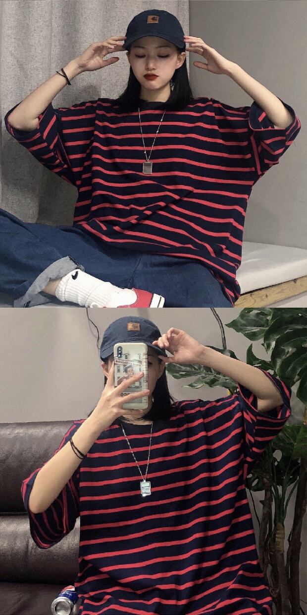 スタンダードストライプルーズラウンドネック半袖スリーブ ショート レトロ ハーフスリーブ かわいい Oネック ケッペル19914899646