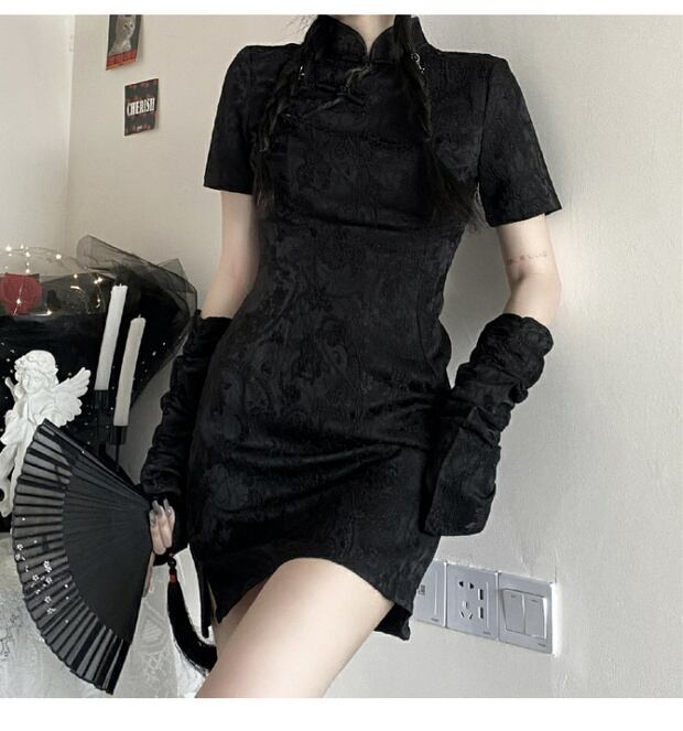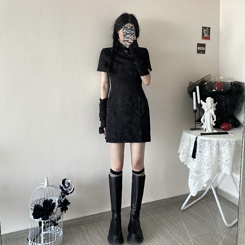 自然派スタイルサマーショートドレス ブラックスカート スタンダードスリム レトロ 夏物 ケッペル74046276967