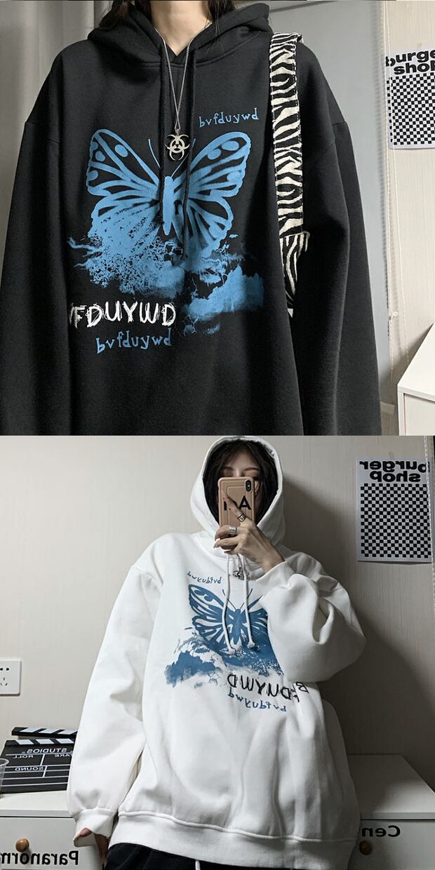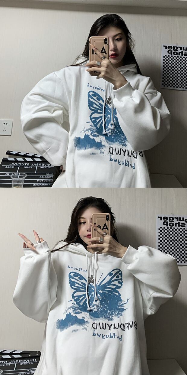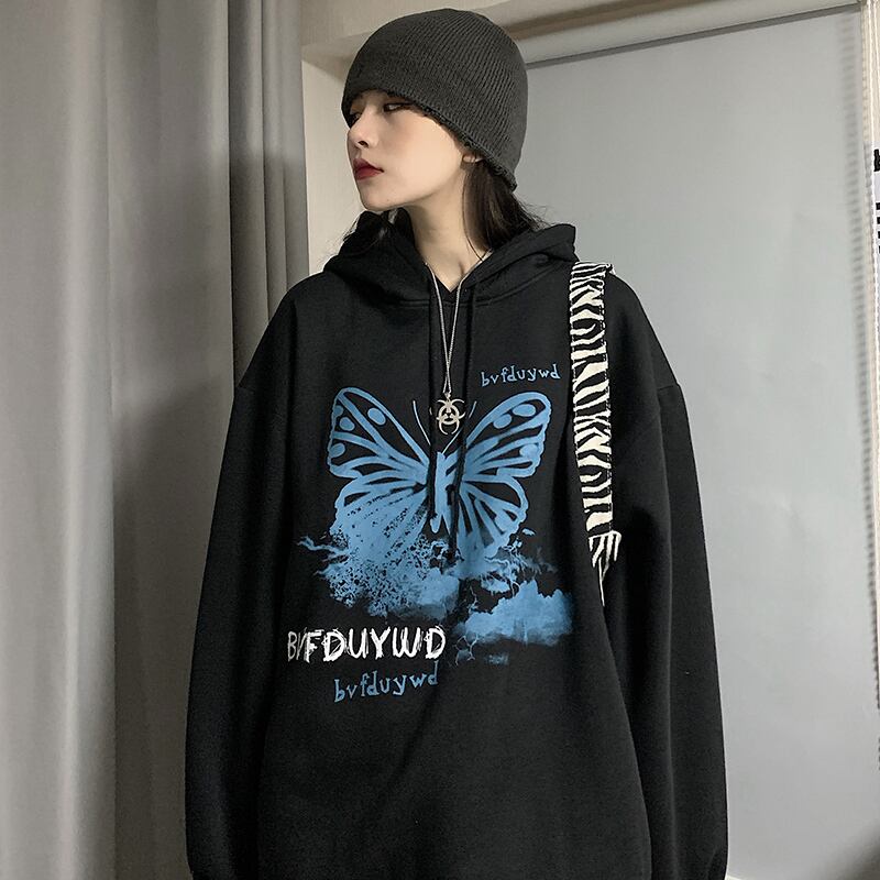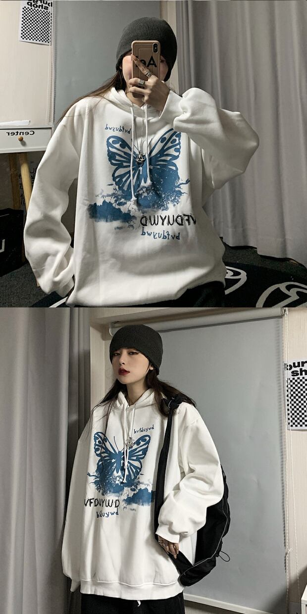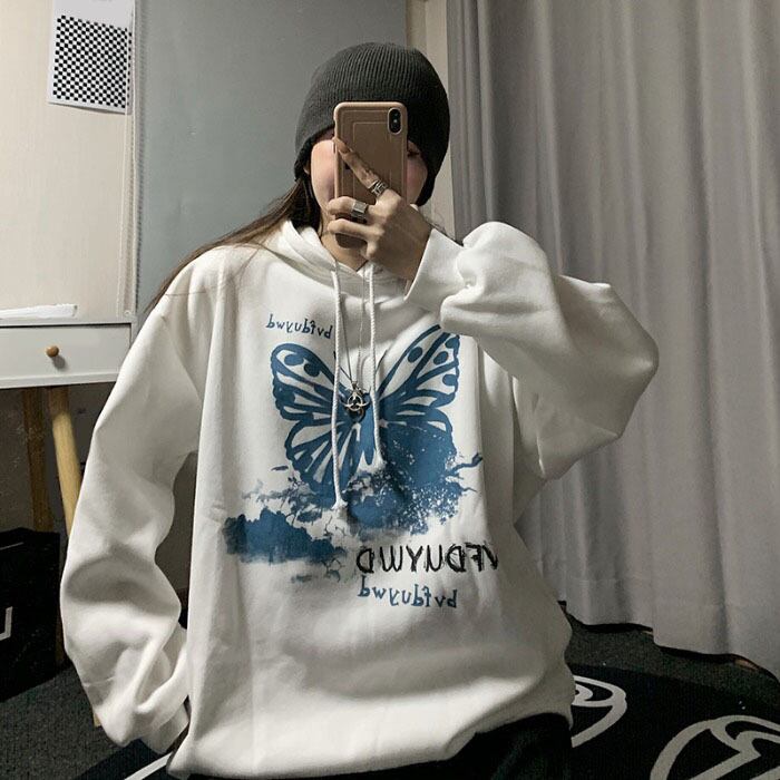 スタイルルーズカジュアルセーター ロングスタンダードButterflyデザイン プリント柄ベルベットフードトップス レトロ かわいい ケッペル96370965022