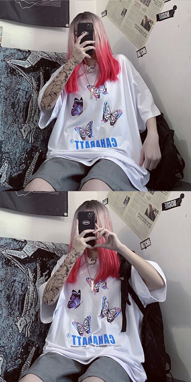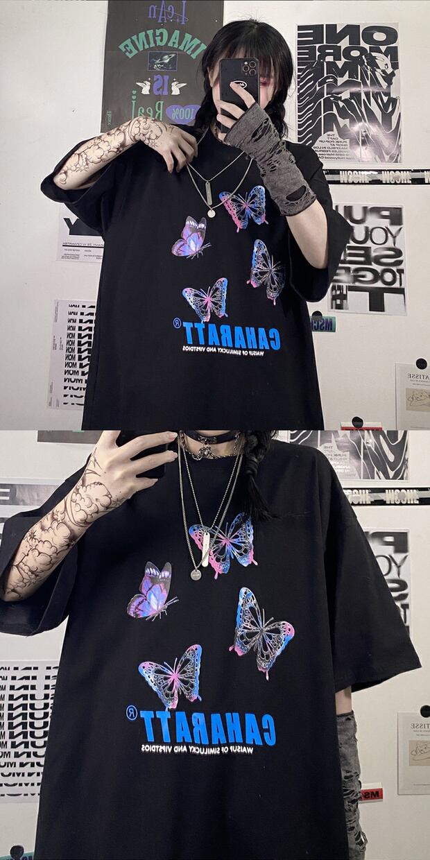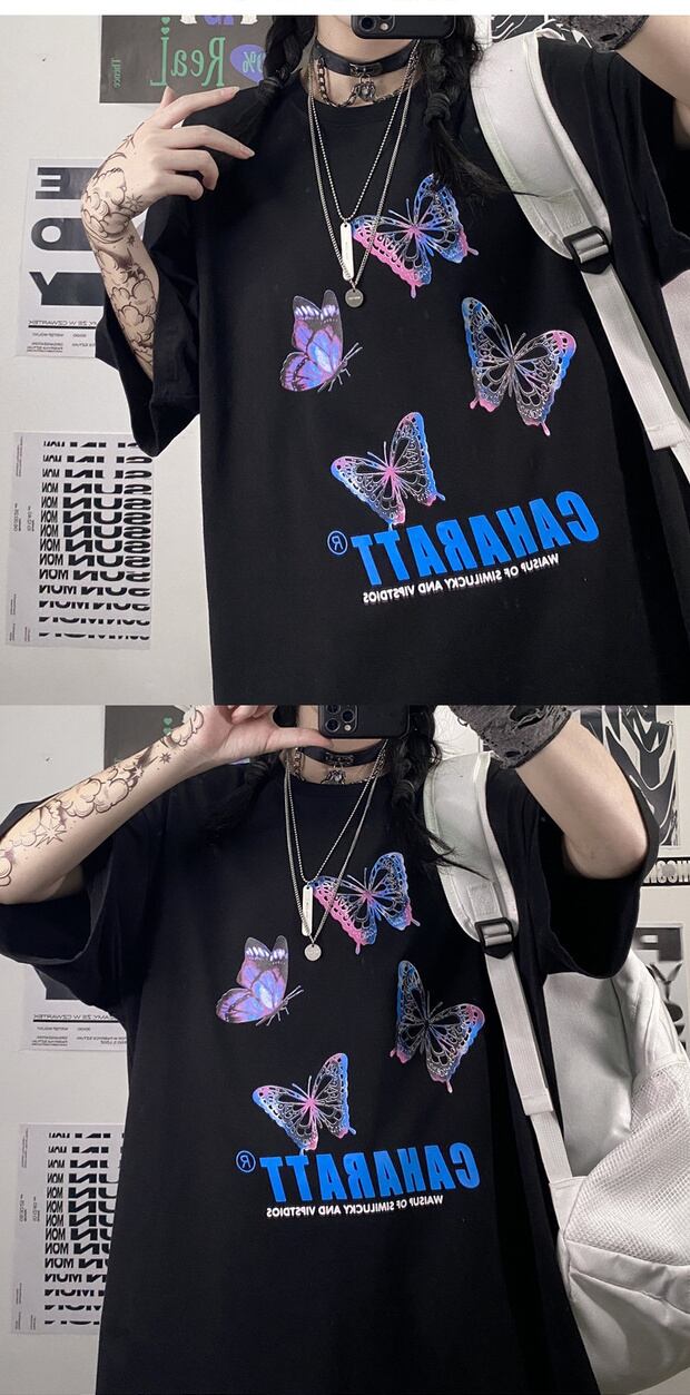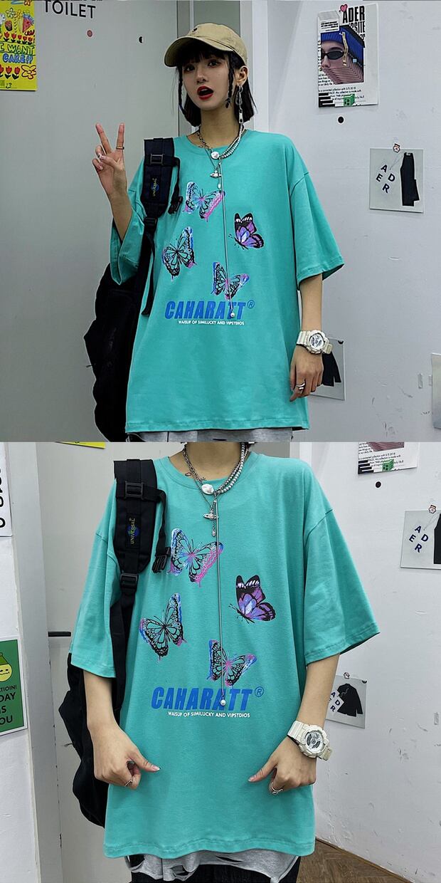 サマーButterflyデザイン プリント柄Tシャツ ルーズラウンドネックトップス 大きめサイズ かわいい 夏物 Oネック ケッペル49659488864