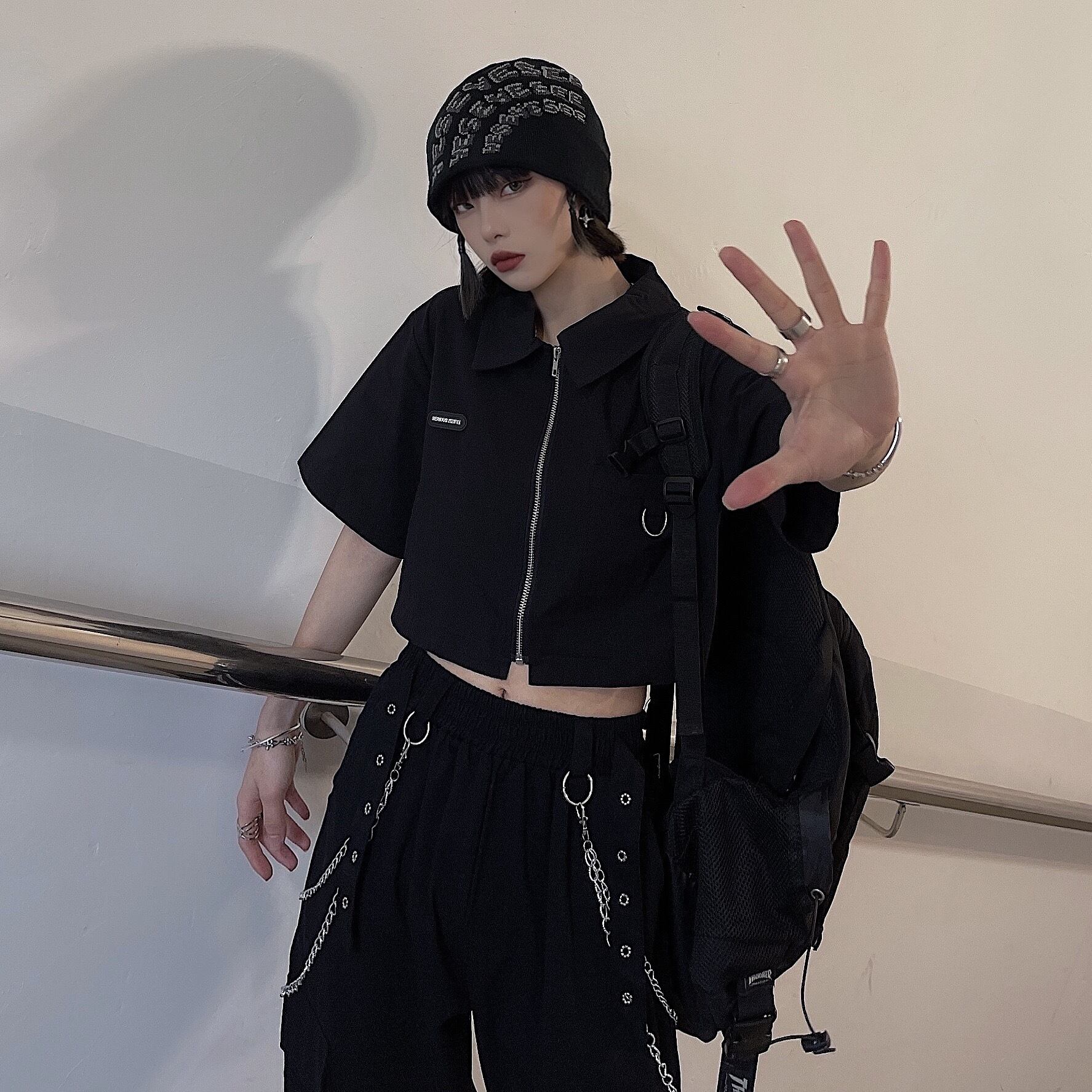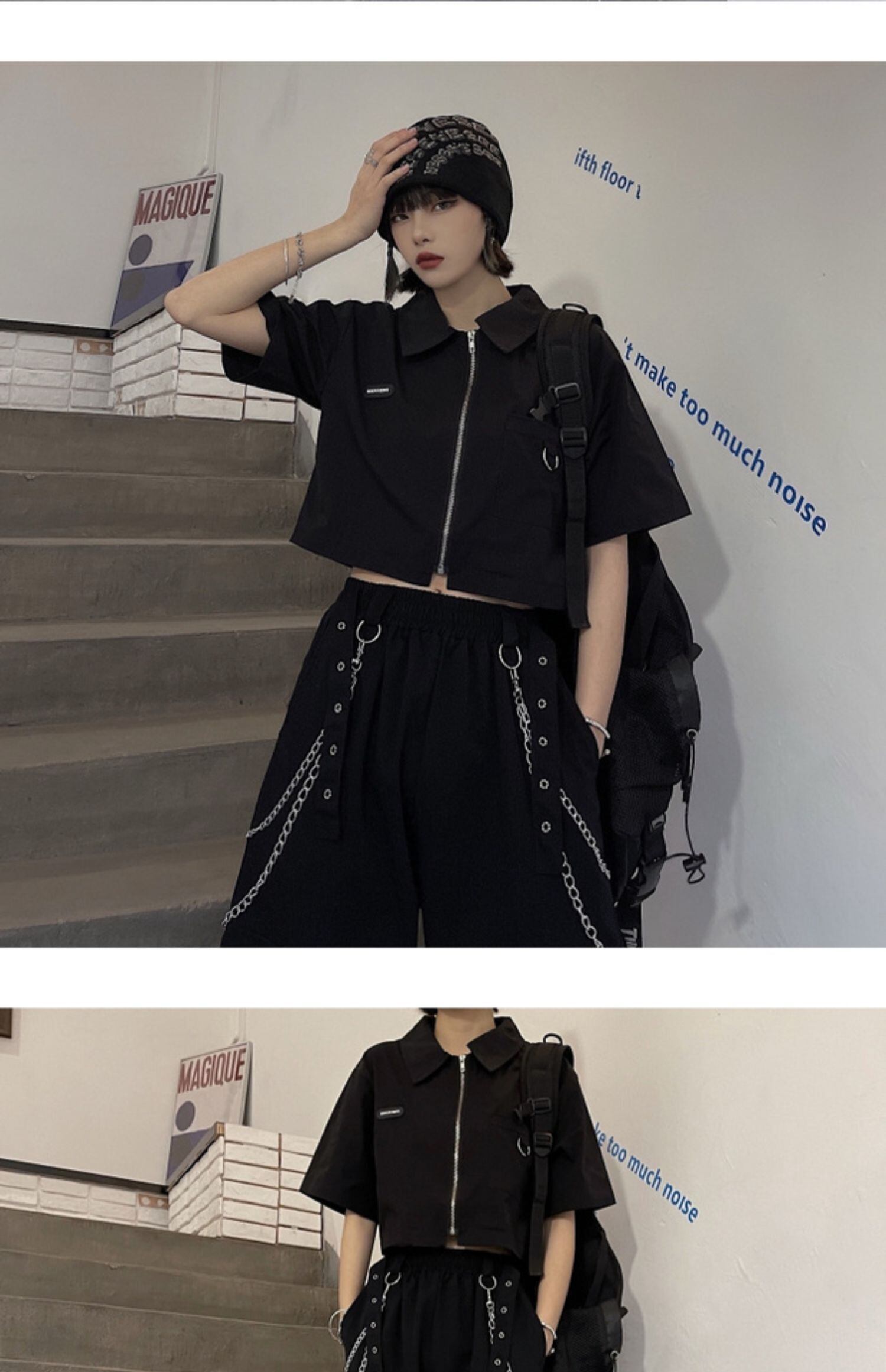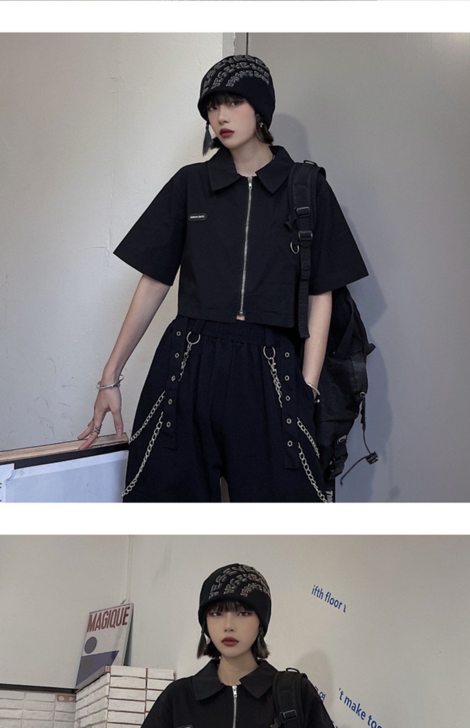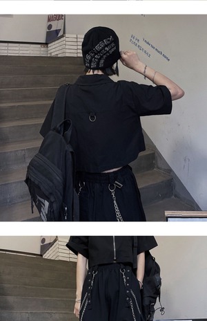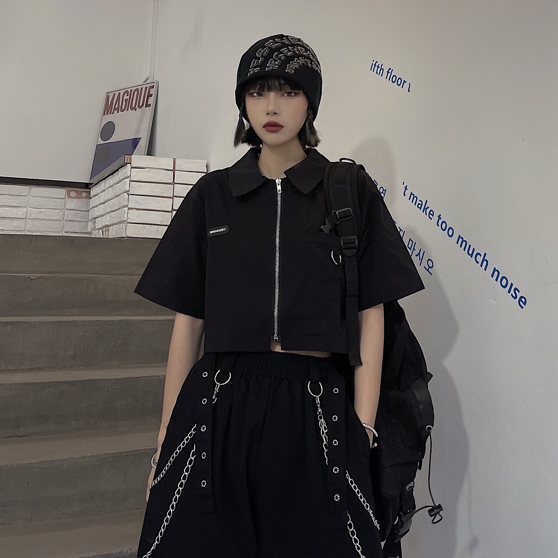 ダークスタイルカジュアルジッパーカーディガンクロップドシャツ ストリート ケッペル75827785092