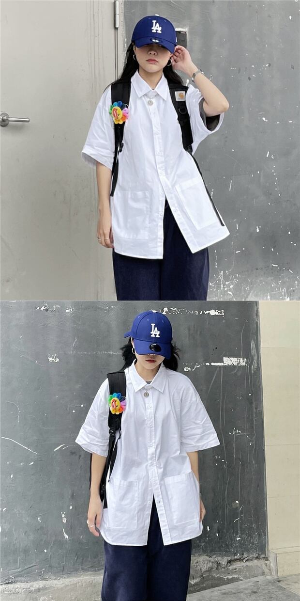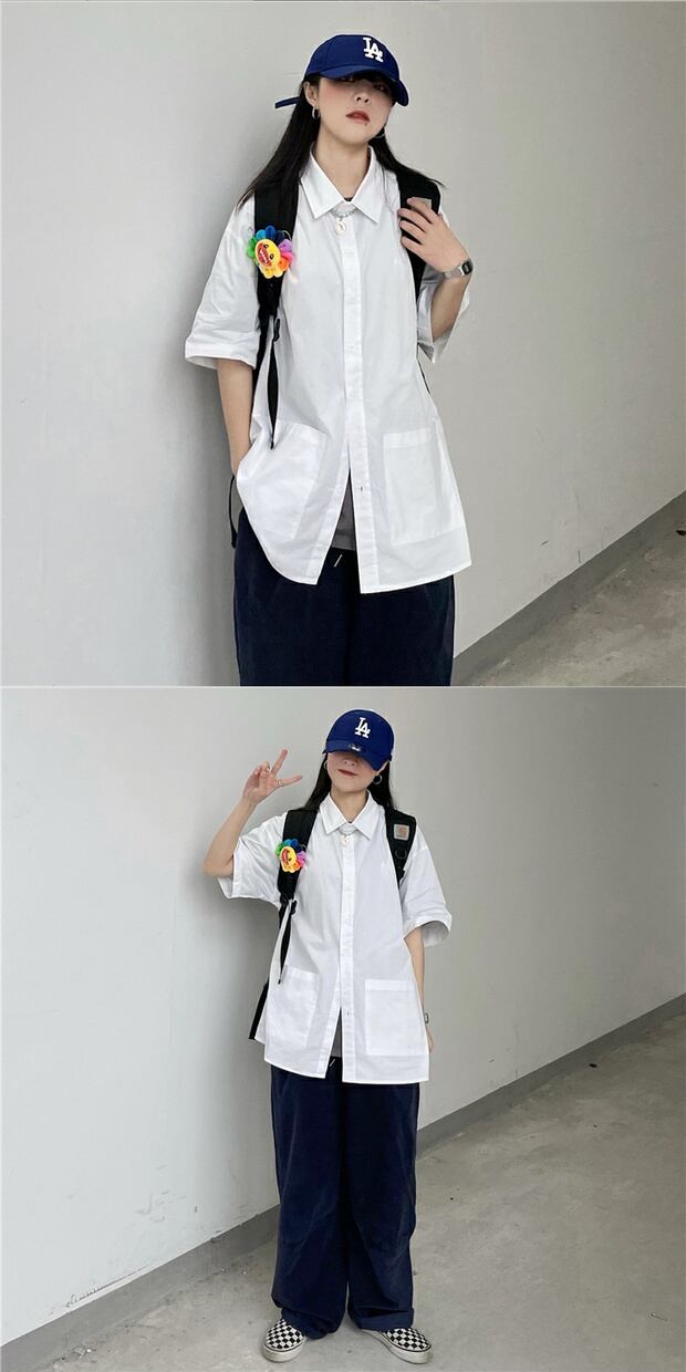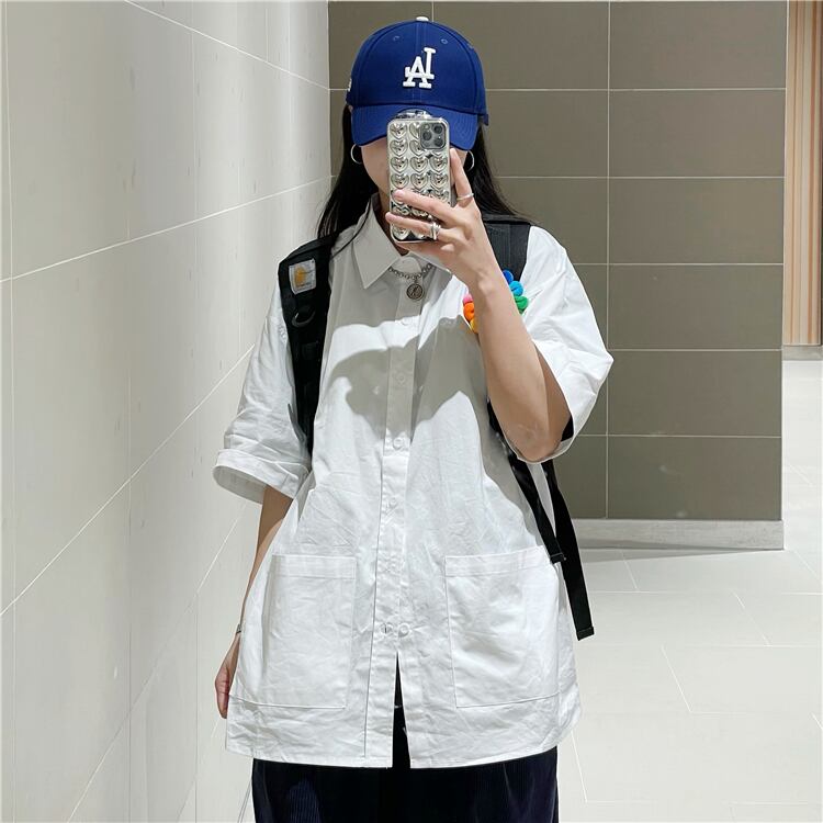サマーホワイトシャツ スタンダードソリッド カラーポケットカジュアルレディース レトロ 夏物 Tシャツ ソリッドカラー ケッペル7999486172
