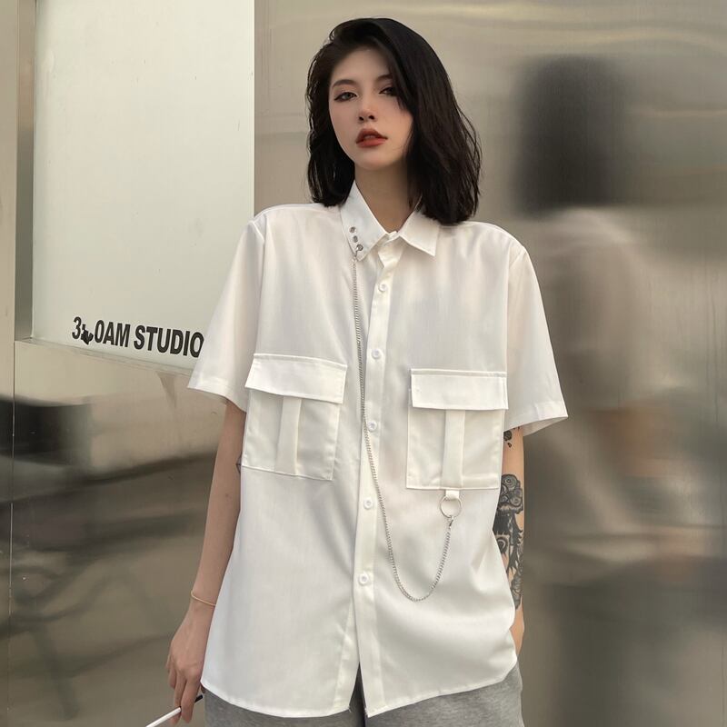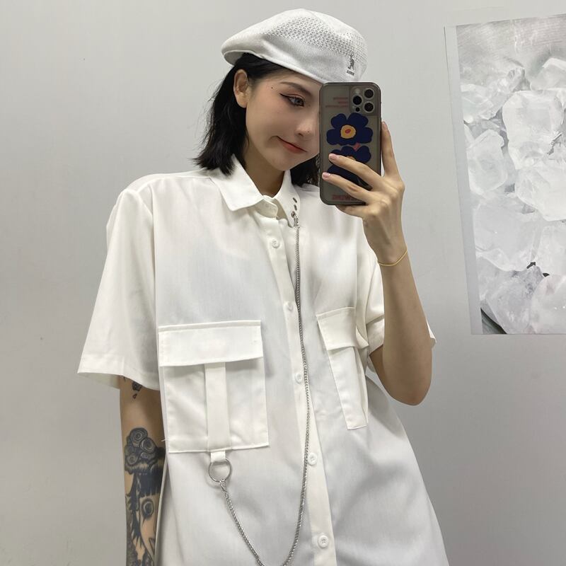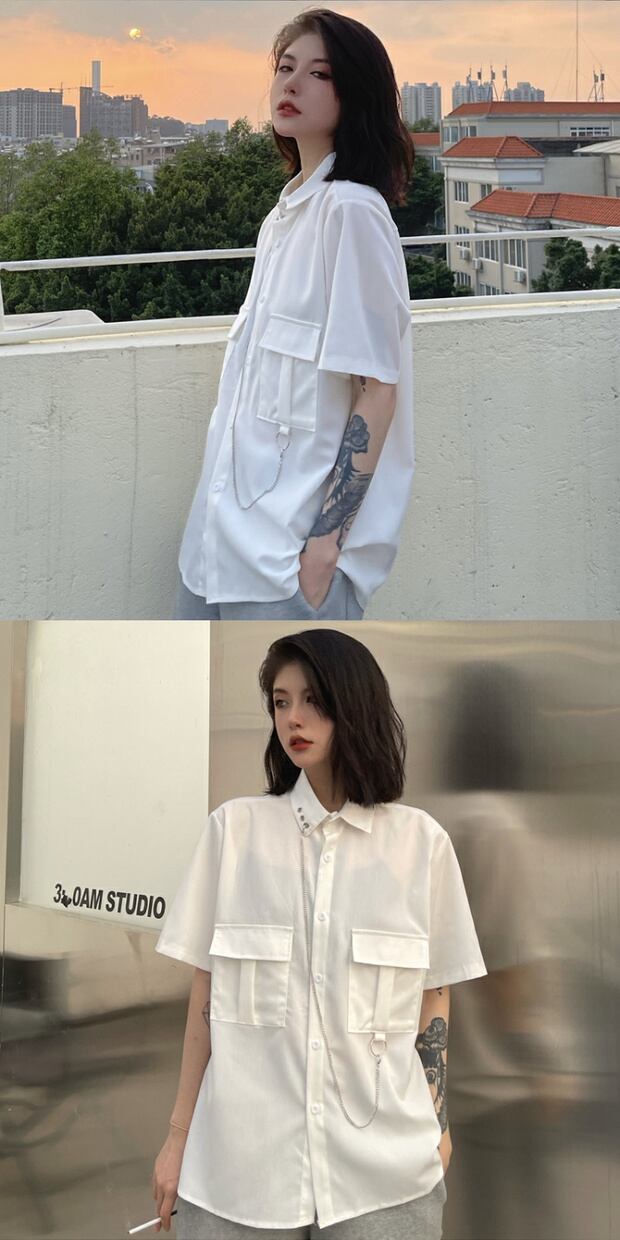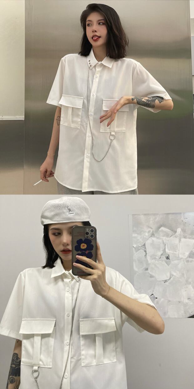 サマーレディーススタンダードポケットシャツ カジュアルルーズホワイト レトロ 夏物 ケッペル11184698543